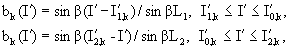 где L1 = I`0,k - I`1,k; L2 = I`2,k - I`0,k. В сущности, сегмент представляет собой короткий вибратор с кусочно-синусоидальным током, причем в общем случае его плечи - отрезки [I`1,k, I`0,k] и [I`0,k, I`2,k] - могут не лежать на одной прямой и иметь разную длину. Соседние сегменты частично перекрываются: средняя точка k-го сегмента I`0,k совпадает с концом (k - 1)-го и началом (k + 1)-го сегментов. Электрические контакты между проводниками (например, в узлах сетки) описываются введением специальных сегментов, плечи каждого из которых лежат на разных проводниках. При этом автоматически выполняется закон Кирхгоффа для узла цепи. На поверхности провода на расстоянии его радиуса у средней точки каждого сегмента вводится соответствующая точка сшивания. Кривые, соединяющие точки сшивания и проходящие по поверхности проводников образуют контур L. Токовая функция представляется в виде разложения по системе базисных функций: