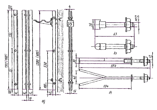 2.2.12. В качестве типовых железобетонных станционных колодцев применяются разветвительные колодцы специальной формы четырех типоразмеров для АТС емкостью 3, 6, 10 и 20 тыс. номеров. На колодцы для АТС 6 тыс. номеров и более устанавливается по два люка. 2.2.13. Кирпичные колодцы строятся из красного кирпича марки 75. Швы кирпичной кладки изнутри выполняются «вподрезку», наружные стены оштукатуриваются цементным раствором марки 50. Перекрытия должны быть железобетонными. В перекрытиях колодцев делают круглые лазы, имеющие форму усеченного конуса с диаметром основания 620 мм и вершины 600 мм. 2.2.14. Все колодцы оборудуются чугунными люками с двумя крышками (чугунной и стальной), изготовленными по ГОСТ 8591-76. При этом для колодцев, размещаемых под пешеходной частью улиц, применяются люки легкого, а под проезжей частью - тяжелого типа. Наружные крышки должны плотно прилегать к корпусам люков. Внутренние крышки люков должны быть окрашены масляной краской и иметь приспособление для запора на замок. 2.2.15. Для выкладки кабелей колодцы оборудуют консолями (ТУ 45-88 6Е0.413.000 ТУ), которые прикрепляют консольными болтами к кронштейнам (ТУ 45-36 АХПО.413.000 ТУ). Кронштейн в вертикальном положении крепят к стенке колодца с помощью ершей (фундаментных болтов). Детали оборудования смотровых устройств (колодцев) приведены на рис. 2, а на рис. 3 показаны чугунные консоли. В колодцах типа ККС-2 кабели размещают на консольных крюках, которые заделывают в стены колодцев. Консольный крюк приведен на рис. 4. Кронштейны из полосовой стали типа ККП применяются для оборудования типовых кабельных колодцев связи. В колодцах типа ККС-3 устанавливают кронштейны длиной 60 см, а в колодцах типа ККС-4 и ККС-5 - длиной 130 см. Для оборудования кабельных колодцев связи с числом вводимых каналов более 24 применяют кронштейны из угловой стали длиной 130 см, а для оборудования нестандартных колодцев, помещений ввода кабелей и коллекторов используют кронштейны из угловой стали длиной 190 см. Рис. 2. Детали оборудования смотровых устройств: а - кронштейны ККУ-130 (190) и ККП-130 (60) с консолью, б - консольный болт, в - стальной ерш для крепления кронштейна Рис. 3. Консоли чугунные 1-, 2-, 3-, 4-, 5- и 6-местные Рис. 4. Консольный крюк 2.2.16. Вводы кабелей в здания телефонных станций осуществляют через специально оборудованные помещения ввода кабелей (шахты), размещаемые, как правило, в подвальном помещении, а в зданиях без подвала - на первом этаже с устройством приямков в полу помещения. Применительно к каждой телефонной станции схема ввода, планировка помещения ввода кабелей, конструкции опорных устройств и каркасов определяются проектом и рабочими чертежами. В помещении ввода кабелей телефонной станции устанавливаются специальные кронштейны с размещенными на них многоместными консолями. В помещении ввода кабелей многопарные линейные кабели распаиваются на станционные кабели емкостью 100 пар. Помещение ввода кабелей соединяется со станционным колодцем трубопроводом или коллектором. В здание АТС емкостью 10000 номеров и более ввод трубопровода выполняют с двух противоположных направлений. 2.2.17. Коллектор представляет собой подземный туннель из сборных железобетонных элементов, предназначаемый для размещения на специальных металлических конструкциях различных коммуникаций (теплопровода, электрических кабелей, теле