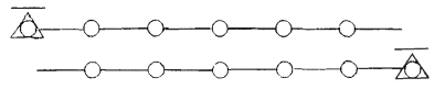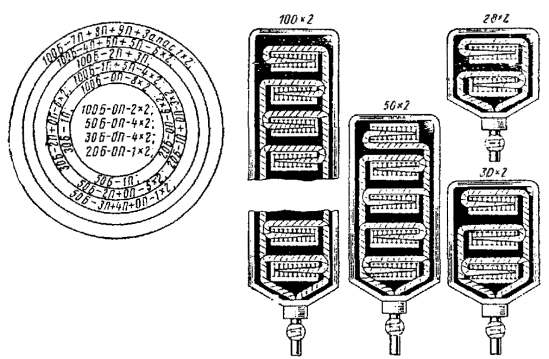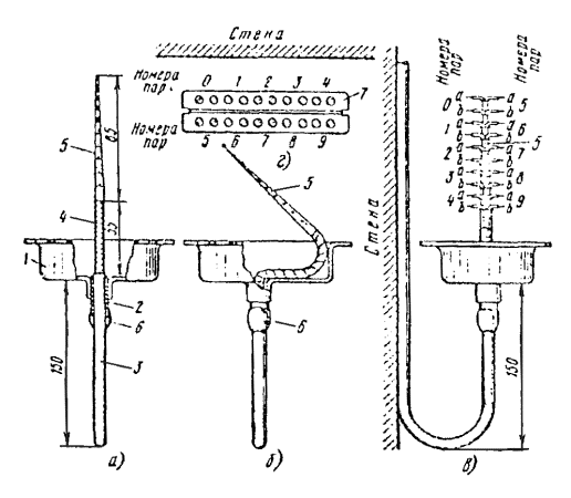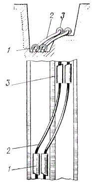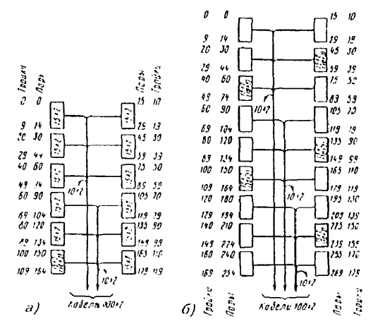 Рис. 7. Нумерация плинтов на боксе и распределение десятипарных пучков жил сердечника кабеля по плинтам. Пример: при зарядке 30-парного бокса (30Б) пучок жил 4´2 центрального повива совместно с пучком жил 6´2 второго повива подается к нулевому плинту (0П); пучок 10´2 первого повива подается к первому плинту (1П), а пучок жил второго повива подается ко второму плинту (2П) - для включения в перья жилы пучка расшивают «елочкой», для чего от пучка отделяют две противоположные пары, которые пожильно раскручивают и отгибают под углом по направлению к перьям. После отгиба жил поверх остального пучка делают очередной стежок ниткой (виток липкой лентой) на расстоянии, равном промежутку между перьями, затем отгибают по направлению к соответствующим перьям жилы следующих пар и так до последней пары пучка. При расшивке пучков в первые зажимы каждой пары следует включать жилы одного цвета. После расшивки каждого пучка лишние концы жил обрезают; - после удаления изоляции концы жил с некоторым запасом по длине (на случай перезарядки) продевают с внутренней стороны в отверстие на конце пера, поджимают плоскогубцами к его поверхности и припаивают припоем ПОССу-40-2; - на перья плинтов с проводниками надевают, в зависимости от вида изоляции жил, бумажные или полиэтиленовые гильзы, которые должны быть на 2 мм длиннее перьев; - в случае применения плинтов с врезными контактами изолированные жилы кабеля устанавливают против разрезных штифтов. Специальным ключом сдавливают жилы в прорези штифтов с одновременным откусыванием излишков жил; - запасные кабельные пары укладывают до верхнего плинта с запасом 10 см и подвязывают отдельно к верхнему пучку. 9.4.7. По окончании зарядки бокса испытывают включенный кабель на обрыв жил, сообщение их между собой и свинцовой оболочкой или экраном, на парность и измеряют сопротивление изоляции. 9.4.8. В оконечных кабельных устройствах под плинтами, а в боксах и под задней крышкой должны быть проложены тонкие картонные прокладки, предварительно прошпаренные массой МКП и промазанные с обеих сторон битумным лаком. При зарядке оконечных кабельных устройств кабелем с бумагомассной изоляцией жил последние должны после снятия оболочки и поясной изоляции прошпариваться массой МКП, а корешок бокса должен заливаться массой МКС. 9.4.9. Разделка (расшивка) кабеля и порядок включения его жил в штифты плинтов показаны для распределительных коробок на рис. 8, а для ящиков (УКС, УКП) - на рис. 9. Рис. 8. Разделка кабеля и порядок включения жил в штифты плинта распределительных коробок типа КРТ-10´2 и КРТП-10´2 а) ввод в коробку; б) выкладка кабеля; в) расшивка 1 - корпус коробки; 2 - втулка; 3 - кабель; 4 - сердечник кабеля; 5 - жгут расшивки; 6 - заделка ввода во втулку; 7 - плинт. Рис. 9. Расшивка кабеля и включение жил на плинты кабельных ящиков емкостью а) 10´2; б) 20´2 9.4.10. При вводе одночетверочного кабеля в междугородный экранированный бокс БМ к вводной трубке бокса припаивают свинцовую трубку длиной 150 - 200 мм (отрезок оболочки кабеля ТГ), внутренний диаметр которой на 1 - 1,5 мм больше внешнего диаметра кабеля. Конец кабеля вводят в бокс через свинцовую трубку на длину 30 см. Затем жилы кабеля припаивают к линейным штифтам боксов, а экранный провод - к экранному штифту (или свободному линейному штифту). Конец свинцовой трубки плотно зачеканивают на кабеле и обматывают 6 - 8