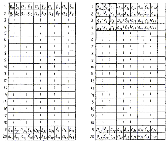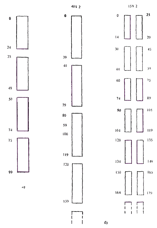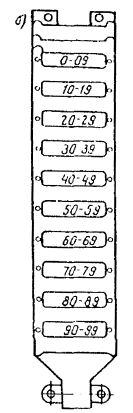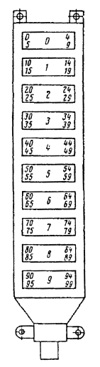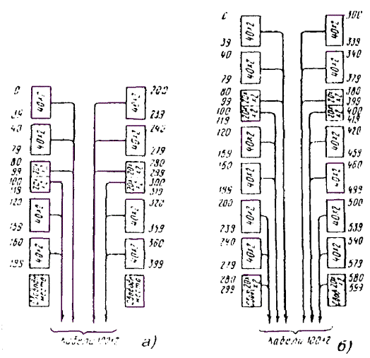 15.1.2. На местных сетях связи применяется приведенный на рис. 16 принцип нумерации оконечных кабельных устройств (распределительных шкафов, распределительных коробок и кабельных ящиков) с началом счета от ближнего конца. 15.1.3. На районированных местных сетях связи распределительные шкафы каждой районной АТС имеют последовательную нумерацию, начиная с первого номера. Кроме того, шкафу присваивается цифровой индекс, соответствующий индексу данной районной АТС. Например, шкафы 15 и 2 АТС 33 имеют нумерацию 3315 и 3302. На нерайонированных сетях индекс АТС к номеру шкафа не добавляется. Рис. 16. Нумерация пар на оконечных кабельных устройствах кросса: а) защитных полосах 25´2 абонентского кросса; б) рамках 40´2 и 15´2 кросса соединительных линий 15.1.4. Боксы в распределительных шкафах нумеруются слева направо, сверху вниз 0, 1, 2, 3 ... . Боксы магистральных кабелей размещаются в распределительных шкафах емкостью 1200 пар в среднем горизонтальном ряду, а в шкафах емкостью 600 и 300 пар - в среднем вертикальном ряду. 15.1.5. Плинты в боксах нумеруются последовательно сверху вниз 0, 1, 2, ... 8, 9. 15.1.6. Каждой распределительной коробке или кабельному ящику присваивается номер, определяемый номерами распределительного шкафа, бокса и плинта. Например, распределительная коробка (или кабельный ящик), включенная в плинт № 7 бокса № 4 распределительного шкафа № 3315, будет иметь номер 3315-47. 15.1.7. Нумерация пар в плинтах, боксов, распределительных коробок и кабельных ящиков производится слева направо: сначала в первом (0, 1, 2, 3, 4), а затем во втором (5, 6, 7, 8, 9) ряду клеммных винтов или врезных контактов. 15.1.8. Нумерация пар в плинте показана на рис. 8, а нумерация пар на кабельном боксе приведена на рис. 17. Номер кабельной пары в распределительном боксе обозначает число, где первая цифра соответствует номеру бокса, вторая цифра - номеру плинта, а третья цифра обозначает номер пары в плинте. Например, пара 153 находится в распределительном боксе, установленном в шкафу на 1-м месте, в 5-м плинте и включена в 3-ю (считая с нуля) пару клемм. Соответственно на другом конце эта пара должна быть включена в клеммы 3 распределительной коробки 5. 15.1.9. При монтаже магистральных кабелей кабельные пары должны включаться в защитные полосы кросса станции в соответствии с включением в боксы магистральной сети в распределительном шкафу. При монтаже рамок линий межстанционной связи должно быть обеспечено соответствие включения кабельных пар (троек) в испытательные рамки кроссов на обеих станциях. Нумерация пар в защитных полосах 25´2, а также рамках 40´2 и 15´2 кросса соединительных линий приведена на рис. 16. Рис. 17. Нумерация пар на кабельном боксе 100´2 15.2. Нумерация колодцев и каналов трубопроводов15.2.1. Каждому колодцу присваивают определенный порядковый номер в соответствии с принятой классификацией. Распределение номеров между типами кабельных колодцев приведено в табл. 15.2. Станционному колодцу обычно присваивают № 1 (2). Последующие колодцы нумеруют возрастающими числами в соответствии с приведенным в табл. 15.2 распределением номеров. 15.2.2. Нумерация каналов трубопроводов ведется, начиная с нижнего ряда, слева направо и снизу вверх. Если в одном направлении проложено несколько отдельных блоков или труб (одноотверстных или многоотверстных), то в каждом блоке или трубе каналы считаются отдельно. Таблица 15.2. Расп