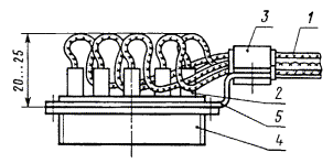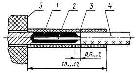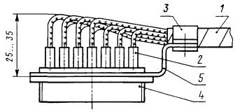 8. Если в одно отверстие контакта соединителя необходимо впаять несколько проводов меньшего сечения, то жилы всех проводов должны быть скручены вместе, а суммарный диаметр облуженных проводов должен быть меньше диаметра соответствующего отверстия в контакте соединителя. 9. Длина паяной части провода, входящего в отверстие крепежной части контакта, должна быть равна длине монтажной части внутренней полости контакта и соответствовать указанной в табл. 1 и на черт. 1. 10. При диаметре отверстия контакта свыше 2,0 мм, а также для проводов с полиэтиленовой изоляцией оголение провода от изоляции не должно быть более 3,0 мм. 11. При монтаже соединителей не допускается применять провода, у которых наружный диаметр по изоляции вместе с надеваемой на провод изоляционной трубкой больше, чем расстояние между осями контактов в соединителе. 12. Резервные контакты в соединителе необходимо запаять отрезками проводов одной из марок, которыми производится монтаж. Рекомендуемая длина проводов 40 - 100 мм. 13. Резервные контакты не следует запаивать в соединителях, заливаемых герметиком или работающих непродолжительное время (до 15 мин разового действия) при воздействии вибрации, соответствующей техническим условиям на соединители. 14. Концы резервных проводов следует заделать в общий жгут в соответствии с черт. 2 - 5. 1 - припой; 2 - жила; 3 - изоляционная трубка; 4 - провод; 5 - соединитель Черт. 1 1 - жгут; 2 - изоляционная лента; 3 - резервные провода Черт. 2