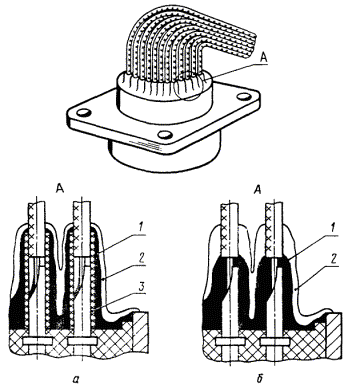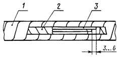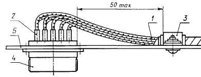 1 - провод; 2 - нитяной бандаж Черт. 4 1 - провод; 2 - изоляционная трубка Черт. 5 15. Провода, заделываемые в соединители, должны быть закреплены у корпуса соединителя с применением кронштейнов или на панели в соответствии с черт. 6. 16. Высота укладки проводов с полиэтиленовой и фторопластовой изоляцией не должна быть более 35 мм (черт. 7), с поливинилхлоридной изоляцией - не более 20 мм. (Измененная редакция, Изм. № 2). 17. Укладка проводов с поливинилхлоридной изоляцией площадью сечения не более 0,20 мм2 должна соответствовать черт. 8. 18. Рихтовка проводов после пайки не допускается. 1 - жгут; 2 - изоляционная трубка; 3 - скоба; 4 - соединитель; 5 - панель Черт. 6 1 - жгут; 2 - изоляционная трубка; 3 - скоба; 4 - соединитель; 5 - кронштейн Черт. 7 1 - жгут; 2 - изоляционная трубка; 3 - скоба; 4 - соединитель; 5 - кронштейн Черт. 8 19. Перемычки в соединителе, выполненные монтажным проводом, следует вводить петлей в жгут. Петли перемычек следует располагать ступенчато. Длина петли перемычки в этом случае не должна превышать 100 мм от крепления жгута у соединителя. Необходимость введения перемычек петлей в жгут определяет разработчик конструкторской документации. (Измененная редакция, Изм. № 2). 20. Перемычки выполняются в соответствии с черт. 9 только при заливке соединителей компаундом или герметиком. При этом петли должны быть минимального размера, позволяющего на контакты соединителя надеть изоляционные трубки. 1 - жгут; 2 - изоляционная трубка; 3 - скоба; 4 - соединитель; 5 - кронштейн; 6 - перемычка Черт. 9 21. При большом количестве перемычек в соединителе и малом количестве цепей (до 10 цепей) перемычки следует вводить ступенчато в ствол жгута в соответствии с черт. 10. Длина части перемычки в стволе жгута не должна превышать 100 мм. 1 - соединитель; 2 - цепи жгута; 3 - перемычки; 4 - жгут; 5 - кронштейн Черт. 10 22. Заливка или обволакивание монтажной части соединителя для защиты от пыли и влаги производится герметикой или компаундом в соответствии с черт. 11. 1 - первый слой герметика; 2 - второй слой герметика; 3 - изоляционная трубка Черт. 11 23. Провода при монтаже не должны иметь повреждений (поджогов, надрезов) и других дефектов, снижающих механическую и электрическую прочность. 24. Провода к контактам соединителей должны подходить свободно без натяжения, быть отрихтованы и иметь запас по длине на перепайку в соответствии с требованием п. 38. При заливке компаундом запас может отсутствовать. 25. Зачистку проводов от изоляции следует производить на глубину отверстия контакта в соответствии с табл. 2. Таблица 2 мм