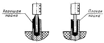 26. Жилы проводов следует скрутить в сторону повива, облудить и отрезать в размер. 27. Монтаж соединителей с плавающими контактами не допускается производить жесткими одно-проволочными проводами. 28. Монтаж, заливку и обволакивание соединителей с плавающими контактами следует производить с технологической ответной частью. 29. При заделке в соединители экранированных проводов, разделанных по ГОСТ 23585, не допускается, чтобы оплетка экранов этих проводов входила в изоляционные трубки, надеваемые на контакты соединителей. 30. Перед пайкой концы проводов жгута следует продеть в отверстие специального шаблона (имитатора контактного поля соединителя) для предупреждения перекрещивания проводов в зоне монтажа. 31. Перед пайкой в контакты соединителей на провода должны быть надеты изоляционные трубки диаметром, обеспечивающим плотную посадку их после пайки на контакте и (или) проводе (проводах). Если соединители подлежат заливке или обволакиванию, возможны два варианта монтажа: а) с трубками; б) без трубок - в соответствии с черт. 11. (Измененная редакция, Изм. № 2). 32. Длина изоляционных трубок, надеваемых на контакты соединителей, должна быть 10 - 12 мм. 33. Соединитель при монтаже следует установить в положение, исключающее затеки флюса внутрь соединителя, так, чтобы срезанная часть контактов была направлена в сторону электромонтажника. 34. В расчлененном состоянии контактная сторона соединителя должна быть закрыта технологической крышкой. 35. Пайку проводов к соединителю следует производить по рядам контактов, начиная с нижнего ряда в направлении слева направо. 36. При пайке жил проводов в соединители выбор мощности паяльника следует производить в соответствии с указаниями НД на соединители. 37. Время пайки жил проводов в контакты соединителей устанавливают в соответствии с указаниями НД на соединители. 36, 37. (Измененная редакция, Изм. № 2). Черт. 12 39. Паяная поверхность монтажных соединений должна быть блестящей или матовой без темных пятен, трещин, раковин, загрязнений, острых выпуклостей и посторонних включений. Припой должен заливать место соединения со всех сторон, заполняя щели и зазоры между жилами проводов и контактами, с незначительными наплывами припоя на наружной поверхности контакта (черт. 12). Количество припоя, необходимого для пайки, должно быть минимальным. Качество пайки в соединителях следует проверять после пайки каждого ряда контактов. (Измененная редакция, Изм. № 1). 40. При выполнении монтажа не должно нарушаться защитное покрытие деталей соединителя, а также покрытие деталей, на которых производится монтаж соединителей. 41. По окончании монтажа соединители должны быть очищены от остатков монтажных материалов и загрязнений. Требование не распространяется на монтаж с применением флюсов, допускающих не производить очистку. 42. Качество пайки соединителей проверяется при межоперационном контроле до надевания на контакты изоляционных трубок. 43. После монтажа и проверки качества пайки изоляционные трубки должны быть надвинуты на контакты до упора в изолятор соединителя. 44. Прозвонку соединителей следует производить с применением технологической ответной части. ИНФОРМАЦИОННЫЕ ДАННЫЕ1. РАЗРАБОТАН И ВНЕСЕН Минобщемашем СССР 2. УТВЕРЖДЕН И ВВЕДЕН В ДЕЙСТВИЕ Постановлением Государственного комитета СССР по стандартам от 26.0
