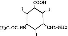3-Ацетиламинометил-5-ацетамидо-2,4,6-трийодбензойная кислота (йодамид)- белый кристаллический порошок. Тпл. - 300 °С. Мало растворим в воде, растворим - в этаноле и метаноле, практически не растворим в эфире и хлороформе. В воздухе находится в виде аэрозоля. Обладает общетоксическим действием. ПДК в воздухе - 2,0 мг/м3. Характеристика метода Метод основан на хроматографировании вещества в тонком слое силикагеля на пластинках «Силуфол» с последующим денситометрированием окрашенных зон при 240 нм. Rf йодамида 0,23 ± 0,03. Отбор проб проводят с концентрированием на фильтр. Нижний предел измерения вещества в анализируемом объеме - 4,0 мкг. Нижний предел измерения вещества в воздухе - 1,0 мг/м3 (при отборе 40 л воздуха). Диапазон измеряемых концентраций от 1,0 до 10,0 мг/м3. Определению не мешают: йодкислота триомбрина, триомбрин, метиодамид. Суммарная погрешность измерения не превышает ±18 %. Время выполнения измерения, включая отбор проб - 2 ч. Приборы, аппаратура, посуда Спектрофотометр «Спекорд М-40» с приставкой для измерения отражения с фотометрическим шаром; денситометр «БИАН-170» Аспирационное устройство «ЭА-30» Фильтродержатели ТУ 95.72.05-77 Хроматографическая камера для ТСХ размером 10 ´ 20 см ГОСТ 23932-79Е Пластинки для тонкослойной хроматографии «Силуфол УФ-254» (ЧСФР) Хроматоскоп Стаканы химические, вместимостью 25 мл ГОСТ 19908-80 Пробирки градуированные с притертыми пробками, вместимостью 10 мл ГОСТ 10515-75 Колбы грушевидные, вместимостью 50 мл ГОСТ 23932-79Е Вакуумная установка Пипетки, вместимостью 1, 2, 5, 10 мл ГОСТ 20292-74Е Реактивы, растворы, материалы Йодамид фармакопейный Этиловый спирт ГОСТ 5963-67 н-Пропиловый спирт ТУ 6-09-402-87 Аммиак водный, х. ч., 25 %-ный раствор ГОСТ 3760-78 Этиловый эфир кислоты уксусной ГОСТ 22300-76 Подвижный растворитель: этилацетат - пропиловый спирт - аммиак (55 : 35 : 20) Стандартный раствор № 1 с концентрацией 1000 мкг/мл готовят растворением 0,10 г вещества в этаноле в мерной колбе вместимостью 100 мл. Раствор устойчив в течение 2-х недель при хранении в холодильнике. Рабочие стандартные растворы, содержащие 40 - 60 - 120 - 240 - 320 - 400 мкг/мл вещества готовят, соответствующим разбавлением этанолом стандартного раствора № 1. Растворы устойчивы в течение 2-х недель при хранении в холодильнике. Фильтры АФА-ВП-10 ТУ 95-743-80 Отбор проб воздуха Воздух с объемным расходом 10 л/мин аспирируют через фильтр АФА-ВП-10, помещенный в фильтродержатель. Для измерения 1/2 ПДК следует отобрать 40 л воздуха. Срок хранения проб - 2-е недели. Подготовка к измерению На пластины «Силуфол УФ-254» наносят в виде точек (диаметр пятна не должен превышать 0,5 см) 0,1 мл стандартных растворов, содержащих 40 - 60 - 120 - 240 - 320 - 400 мкг/мл вещества, что соответствует 4,0 - 6,0 - 12,0 - 24,0 - 32,0 - 40,0 мкг йодамина. Пластины со стандартными образцами помещают в камеру для хроматографирования с системой растворителей этилацетат - н-пропанол - аммиак (55 : 35 : 20) мл. После поднятия подвижной фазы до конца пластинки, ее вынимают из камеры и сушат на воздухе 3 - 5 мин. Для обнаружения йодамина пластинки смотрят под хроматоскопом и простым карандашом или иголкой очерчивают зоны пятен на пластинке. Затем интенсивность окраски пятен вещества измеряют на спектрофотометре «Спекорд М-40» с приставкой для измерения отражения с фотометрическим шаром при длине волны 240 нм. В качестве фона используется участок исследуемой пластинки без вещества. Для каждой к