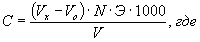Vх - эквивалентный объем титранта, пошедший на титрование, мл; Vg - количество титранта, пошедшего на титрование до последнего плюса II-ой производной, мл; DV - шаг титрования, мл; Е1" - последняя положительная величина II-ой производной потенциала, мв; E2" - первая отрицательная величина II-ой производной потенциала, мв. Расчет концентрации Концентрацию три(оксиметил)аминометана гидрохлорида (С) в воздухе (мг/м3) вычисляют по формуле: