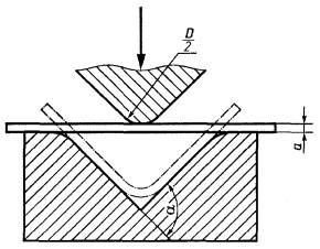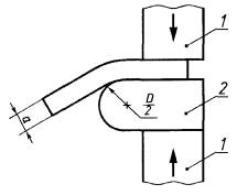 4 Сущность методаИспытание на изгиб заключается в пластической деформации образца круглого, квадратного, прямоугольного или многоугольного сечения путем изгиба без изменения направления действия силы до достижения заданного угла изгиба. Оси двух опор при изгибе образца должны оставаться в плоскости, перпендикулярной к направлению действия силы. При изгибе на 180° две боковые поверхности могут, в зависимости от требований стандарта на металлопродукцию, соприкасаться друг с другом или быть параллельными, находясь одна от другой на заданном расстоянии; для контроля этого расстояния применяют прокладку. 5 Аппаратура5.1 Испытание на изгиб должно проводиться на универсальных испытательных машинах или прессах (ГОСТ 28840), снабженных следующими устройствами: - изгибающим устройством с двумя опорами и оправкой (рисунок 1); - изгибающим устройством с V-образной выемкой и оправкой (рисунок 2); - изгибающим устройством с тисками (рисунок 3). 5.2 Изгибающее устройство с опорами и оправкой 5.2.1 Длина опор и ширина оправки должны превышать ширину или диаметр образца. Диаметр оправки определяется нормативным документом на металлопродукцию. Опоры для образца и оправка должны быть достаточно твердыми. Дополнительные требования к оправке и опорам приведены в приложении А. 1 - тиски; 2 - оправка Рисунок 3 5.2.2 Если нет иных указаний, то расстояние между опорами l определяют по формуле l = (D + 3a) ± a/2, (1) где D - диаметр оправки, мм; a - толщина (диаметр) образца, мм. Данное расстояние не должно изменяться в течение всего испытания на изгиб. 5.3 Изгибающее устройство с V-образной выемкой и оправкой Наклонные плоскости V-образной выемкой образуют угол 180° - α (рисунок 2). Величина угла α устанавливается нормативными документами на металлопродукцию. Кромки V-образной выемки должны иметь радиус закругления, в 1 - 10 раз превышающий толщину образца, и должны быть достаточно твердыми. Дополнительные требования к изгибающему устройству приведены в приложении А. 5.4 Изгибающее устройство с тисками Устройство состоит из тисков и оправки достаточной твердости; оно может быть снабжено рычагом для приложения усилия к образцу (рисунок 3). Дополнительные требования к изгибающему устройству приведены в приложении А. 6 Подготовка к испытанию6.1 Отбор проб, заготовок и образцов - по нормативным документам на металлопродукцию. Дополнительные требования к отбору заготовок и образцов приведены в приложении А. 6.2 Для испытания применяют образцы круглого, квадратного, прямоугольного или многоугольного сечения. Любые участки материала, подвергавшиеся резке ножницами, пламенной резке или аналогичным операциям во время отбора проб, должны быть удалены. Если такие участки не удалены, допускается проводить испытания образцов на изгиб при условии, что результаты испытаний будут соответствовать нормативным документам на металлопродукцию. 6.3 Кромки образцов прямоугольного сечения должны быть закруглены радиусом не более 0,1 толщины образца. Закругление должно выполняться таким образом, чтобы оно не влекло за собой образование поперечных заусенцев, царапин или вмятин, которые могут отрицательно влиять на результаты испытания. Допускается проводить испытания на образце с незакругленными кромками при условии, что результаты испытания будут соответствовать нормативным документам на мета
