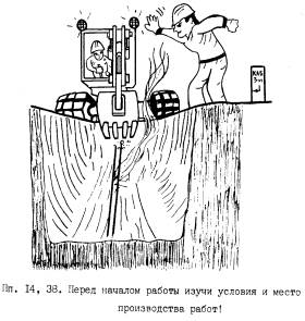 14. Перед началом работы машинист должен получить задание, точные и конкретные указания по его выполнению, безопасным приемам и методам организации труда. Изучить условия и место производства работ. Ознакомить персонал, обслуживающий экскаватор, с заданием и условиями его выполнения.