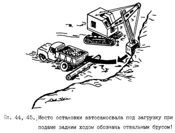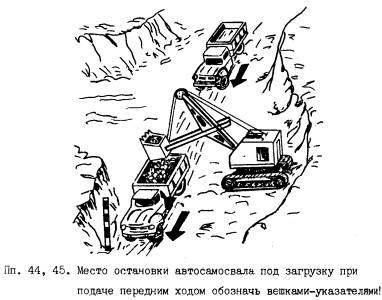 45. Погрузку автомобилей следует производить со стороны заднего или бокового его борта. Запрещается проносить ковш над людьми и кабиной водителя. Во время погрузки водитель не должен находиться в кабине автомобиля, если она не имеет защитного козырька над кабиной.