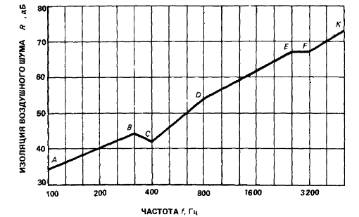 2. РАСЧЕТ ЗВУКОИЗОЛЯЦИИ ОГРАЖДАЮЩИХ КОНСТРУКЦИЙ 11 Размерность раздела принята по СНиП II-12-77. 2.1. Расчет звукоизоляции проводится при проектировании ограждающих конструкций. Окончательная оценка звукоизоляции ограждающих конструкций зданий, выстроенных по новым типовым проектам, должна производиться на основе натурных испытаний ограждающих конструкций экспериментальных зданий. 2.2. Индекс изоляции воздушного шума ограждающей конструкцией следует определять первоначально по формулам: для вертикальных ограждений R´w = 32 lg m + 2 lg d - 17 дБ; (1) для горизонтальных ограждений R´w = 32 lg m + 2 lg d - 18 дБ, (2) где m - поверхностная плотность одной стенки блока, кг/м2; d - толщина воздушной прослойки, см. Примечание. Если стенки смежных блоков имеют неодинаковую толщину, то при различии поверхностных плотностей не более чем на 20 % за расчетную величину поверхностной плотности принимают их среднеарифметическое значение. При большем различии поверхностных плотностей выражения (1) и (2) применяться не могут. 2.3. После ориентировочного выбора толщины стенки блока и воздушной прослойки строится частотная характеристика изоляции воздушного шума, и по ней окончательно определяется индекс изоляции воздушного шума. Расчет индексов изоляции выполняется в соответствии c прил. 1 и 2. 2.4. Частотную характеристику изоляции воздушного шума стенами без дверей (с воздушной прослойкой в пределах 4 - 10 см) следует определять графическим способом, изображая ее в виде ломаной линии, аналогичной ABCDEFK на рис. 1. Координаты точки B (RB и fB) частотной характеристики определяют по формулам: