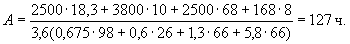 Пример расчета показателя длительности остывания А I вариант. Тепловая обработка железобетонных изделий, приготовленных на цементе I группы класса В22,5 (М300) осуществляется в блоке, состоящем из трех камер ямного типа. Внутренние размеры одной камеры, м: длина - 7, ширина - 2,5, высота - 3,5. Заглубление днища камеры в грунт относительно пола цеха - 0,5 м. Толщина бетонных стенок, днища и перегородок камеры - 0,3 м, материал - тяжелый бетон. Объем бетона прогреваемых изделий в каждой камере - Vб = 6,1 м3; масса находящегося в одной камере металла форм gф = 18,3 т; масса металлических элементов крышки одной камеры gкр = 3,13 т; масса металла стоек пакетировщиков в одной камере gп = 1,86 т. Расчет Площадь поверхности наружных стен блока камер выше нулевой отметки пола F1 = 2[(7 + 2×0,3) + 3×2,5 + 4×0,3](3,5 - 0,5) = 98 м2; площадь поверхности наружных стен блока камер ниже нулевой отметки пола F2 = 2[(7 + 2×0,3) + 3×2,5 + 4×0,3](0,5 + 0,3) = 26 м2; поверхность днища блока камер F3 = (7 + 2×0,3)(3×2,5 + 4×0,3) = 66 м2; площадь поверхности крышек принимаем равной площади поверхности днища F4 = F3 = 66 м2. Объем бетона ограждающих конструкций, включая перегородки Vок = 7×3,5×4×0,3 + (2,5×3 + 4×0,3)3,5×2×0,3 + (7 + 2×0,3)×(2,5×3 + 4×0,3)0,3 = 67,5 ≈ 68 м3. Общий объем металла в блоке камер по формуле (2) Vм = (gф + gкр + gп)/7800 = (18300×3 + 3130×3 + 1860×3)/7800 = 8,96 ≈ 9 м3. Значения объемных теплоемкостей принимаем: для тяжелого бетона изделий и ограждений (cγ)б = (cγ)ок = 2500 кДж/(м3×°С); для металла форм, стоек и крышек (cγ)м = 3800 кДж/(м3×°С). Значения коэффициентов теплопередачи Ki принимаем в соответствии с данными табл. 1. Показатель длительности остывания А рассчитываем по формуле