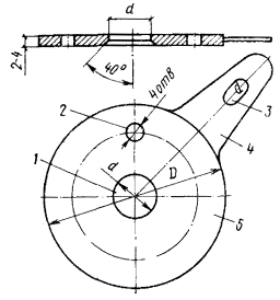 Дроссельная диафрагма. 1 - проходное отверстие диафрагмы; 2 - крепежные отверстия; 3 - клеймо; 4 - рукоятка; 5 - корпус (шайба) 2. Дроссельные диафрагмы устанавливаются на паровых вводах в установки, как при наличии автоматизированных систем регулирования температурного режима, так и без них. При применении автоматических систем регулирования диафрагма подбирается из условия максимального часового расхода пара. Дроссельные диафрагмы могут эффективно работать только при оснащении магистральных паропроводов регуляторами давления пара. 3. Дроссельная диафрагма представляет собой стальную пластину толщиной 2 - 3 мм, в которой выполнено отверстие, рассчитанное для пропускания требуемого количества пара (см. рисунок). 4. Для подбора диаметра отверстий дроссельных диафрагм первоначально определяется удельный расчетный расход тепловой энергии Q в соответствии с рекомендациями прил. 3. 5. По удельному расходу тепловой энергии Q, кг/ч, рассчитывается часовой расход пара по формуле G = QVб0,43/τ, где Vб - объем пропариваемого бетона в плотном теле, м3; τ - продолжительность подачи пара в установку, ч. 6. Выбор диаметра отверстия дроссельной диафрагмы, обеспечивающего дозированный расчетный расход пара в час, осуществляется по таблице пропускной способности дроссельных диафрагм для заданного стабилизированного давления пара. Пропускная способность дроссельных диафрагм