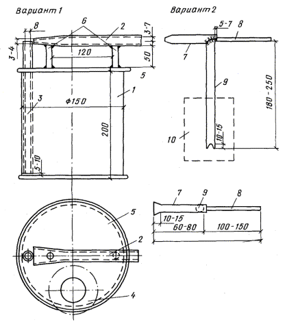 3.16. При назначении режимов тепловой обработки многослойных изделий, состоящих из тяжелых и легких бетонов, следует учитывать условия формования «лицом» вверх или вниз. Температурно-влажностные условия режима тепловой обработки следует назначать по верхнему слою бетона, контактирующему с теплоносителем. За расчетную толщину изделия следует принимать толщину за вычетом высоты слоя утеплителя. 3.17. Продолжительность выдерживания распалубленных изделий в цехе при температуре наружного воздуха ниже 0 °С после окончания тепловой обработки следует принимать 12 ч. При отсутствии необходимых площадей длительность выдерживания может быть сокращена до 8 - 6 ч. В этих случаях необходимо длительность изотермического выдерживания увеличивать соответственно на 0,5 или 1 ч. На полигонах остывание изделий в камерах должно продолжаться до перепада температур между изделием и наружным воздухом не более 40 °С. 3.18. При прогреве бетона в продуктах сгорания природного газа без увлажнения среды, в том числе и при термосных режимах, необходимо предусматривать защиту тяжелого бетона изделий от испарения влаги. 3.19. Для защиты бетона изделий от испарения влаги могут быть использованы любые известные способы, такие, как различные пленкообразующие, влагонепроницаемые и гидрофобизирующие составы, смазки и т.д. 3.20. Нанесение защитного слоя следует проводить сразу же после окончания формовки и отделки верхней открытой поверхности изделий. 3.21. В качестве гидрофобизирующих и влагозащитных покрытий могут быть использованы, например, эмульсол, машинное масло или составы, применяемые на заводах железобетонных изделий для смазки металлических форм. Предварительно смазку следует проверить на испарение в лабораторных условиях в сушильном шкафу при температуре 100 °С. Смазку, налитую в металлическую или стеклянную банку слоем 3 - 5 мм, взвешивают с точностью 0,1 г до и после окончания прогрева. Время прогрева принимают равным длительности принятого на заводе режима тепловой обработки. Если вес ее не изменился, значит смазка пригодна для защиты бетона изделий от испарения влаги. Смазку наносят с помощью установок СМЖ-18А или упрощенно пульверизатором путем мелкого набрызга (рис. 1). Ориентировочный расход смазки 90 - 100 г/м2. Количество наносимой смазки уточняется в каждом конкретном случае. Поверхность изделия должна быть увлажненной до конца изотермического прогрева. 3.22. Отсутствие испарения влаги повышает температуру бетона. При температуре среды 90 - 95 °С бетон прогревается до 80 - 85 °С. 4. КОНТРОЛЬ РЕЖИМА ТЕПЛОВОЙ ОБРАБОТКИ4.1. При тепловой обработке изделий из бетонов продуктами сгорания природного газа оператор контролирует и заносит в журнал лабораторного контроля следующие показатели: номер загружаемой камеры; тип, количество изделий; время окончания загрузки камеры; время начала и конца тепловой обработки; температуру и относительную влажность среды в камере - 1 раз в час; разрежение в камере - 1 раз в час за цикл прогрева и при каждой регулировке. Рис. 1. Разбрызгиватель эмульсола (вариант 1 и 2) 1 - бачок (V = 3,6 л) из оцинкованной стали d = 0,7 мм; 2 - труба (диаметр 1/2"), подающая сжатый воздух; 3 - труба, подающая эмульсол (Æ 8 мм); 4 - наливная воронка; 5 - крышка из стального листа d = 2 мм; 6 - стойки (Æ 10 мм); 7 - труба (диаметр 1/2"); 8 - труба (Æ 6 - 8 мм); 9 - труба (Æ 1/2"); 10 - емкость для э