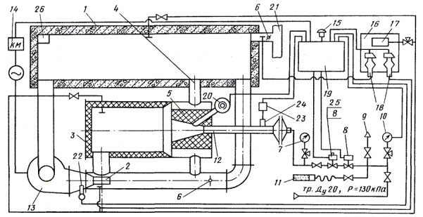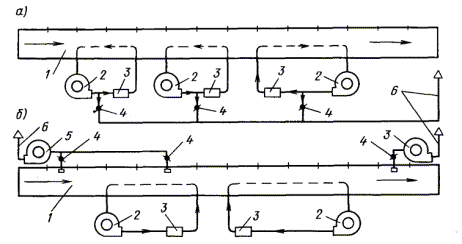 7.2. Рекомендуемая схема расстановки двух теплогенераторов для обслуживания одной камеры представлена на рис. 6. При объеме камеры более 200 м3 обязательна установка двух теплогенераторов. Рис. 6. Схема подключения двух теплогенераторов к камере периодического действия 1 - камера; 2 - рециркуляционный вентилятор; 3 - теплогенератор; 4 - шибер 7.3. При производительности одной щелевой или туннельной камеры более 6 м3 бетона в час схема расстановки теплогенераторов и их количество должны быть согласованы с ВНПО «Союзпромгаз». 8. СИСТЕМЫ РЕЦИРКУЛЯЦИИ8.1. Газоходы рециркуляции выполняются из стальных труб любого типа с толщиной стенки не менее 1 мм. Для газохода от теплогенератора в камеру рекомендуется применять трубу диаметром 325 мм. Допускается применение трубы диаметром 325 - 350 мм. При увеличении длины рециркуляционного газохода рекомендуется удлинительный участок монтировать между теплогенератором и рециркуляционным вентилятором. При длине газохода от камеры (или от рециркуляционного вентилятора) до теплогенератора до 10 м рекомендуется применять трубу диаметром 325 мм, допускается применение трубы диаметром 325 - 350 мм. При длине газохода от камеры (или от рециркуляционного вентилятора) до теплогенератора свыше 10 м следует применять трубу диаметром 400 - 450 мм. 8.2. Соединение газоходов рециркуляции с теплогенератором, рециркуляционным вентилятором и камерой тепловой обработки должно исключать выбивание рециркулируемых газов или подсасывание в систему атмосферного воздуха. 8.3. Повороты газоходов рециркуляции должны быть выполнены в соответствии с нормами радиуса гибки труб. 8.4. Газоходы рециркуляции должны быть теплоизолированы снаружи. Температура наружной поверхности теплоизоляции не должна превышать 45 °С. 8.5. Конструкция газоходов рециркуляции должна учитывать их температурное расширение при нагреве до 150 °С (газоход от теплогенератора в камеру) и до 100 °С (газоход от камеры к теплогенератору). При общей длине газоходов рециркуляции не более 5 м, их температурное расширение можно не учитывать. 8.6. При применении теплогенератора ТОК-1 газоход рециркуляции от теплогенератора в камеру должен быть не длиннее 5 м и иметь не более одного поворота до 90°. Газоход рециркуляции от камеры к теплогенератору должен быть не длиннее 40 м и иметь не более двух поворотов до 90°. 8.7. При применении теплогенератора ТОК-1А газоход рециркуляции от теплогенератора в камеру должен быть не длиннее 10 м и иметь не более двух поворотов до 90°. Газоход рециркуляции от камеры к теплогенератору должен быть не длиннее 40 м и иметь не более двух поворотов до 90° при условии, что суммарное количество поворотов в газоходах рециркуляции не должно быть более трех. 8.8. Требования к газоходам рециркуляции теплогенератора ТОБ-2 такие же, как при применении теплогенератора ТОК-1А (см. п. 8.7). 9. СИСТЕМЫ ВЕНТИЛЯЦИИ9.1. Системы вентиляции предназначены для предотвращения попадания продуктов сгорания в помещение цехов и рабочие зоны (при размещении камер на полигоне) и обеспечения разрежения 5 - 10 Па (0,5 - 1 мм вод. ст.). 9.2. Газоходы вентиляции целесообразно выполнять из стальных труб. Отверстия для вывода уходящих газов из камер в вентиляционную систему не рекомендуется размещать напротив отверстий, через которые в камеру подаются рециркулируемые газы из теплогенератора. 9.3. Диаметры 