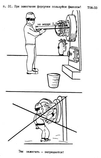 23. Перед началом работы форсунщик обязан: - надеть спецодежду и спецобувь, подготовить средства индивидуальной защиты; - ознакомиться по журналу с записями о работе форсунок и коммуникаций в предыдущую смену; - получить от бригадира или мастера точные и конкретные указания по выполнению задания, безопасным приемам и методам труда; - проверить исправность средств связи и сигнализации; - проверить наличие и комплектность необходимых инструментов и приспособлений; - проверить наличие средств пожаротушения, оказания доврачебной первой помощи; 24. Перед зажиганием форсунки, работающей на жидком топливе (мазуте), необходимо: - проверить наличие и исправность пламезащитных экранов; - во избежание взрыва убедиться в отсутствии топлива в топке и, если оно есть, удалить его путем протирания топки изнутри ветошью; - проверить давление жидкого топлива (мазута) в топливной магистрали; - проветрить топку в течение 10-15 мин.; - если имеется вентилятор для подачи воздуха, проветрить топку при включенном вентиляторе; - проверить наличие разряжения воздуха в топке (до шибера), при необходимости отрегулировать тягу. 25. Перед зажиганием газовой горелки: - открыть задвижку крана на продувочную свечу; - проверить давление газа и разряжение в топке; - провентилировать топку в течение 10-15 минут; - проверить наличие тяги перед шибером; - продуть газопровод через продувочную свечу в течение 2 минут. 26. Газопроводы должны иметь герметическое соединение, не допускающее утечки газа. 27. О результатах проверки форсунки (газовой горелки) и коммуникаций форсунщик должен доложить мастеру или бригадиру. При необходимости принять соответствующие меры. 28. Зажигать неисправную форсунку (горелку) запрещается. После устранения неисправности зажигание производить только по разрешению мастера или бригадира. 29. Зажигание форсунки (горелки) форсунщик должен производить только с разрешения мастера (бригадира) через 2-3 минуты после поступления общего сигнала о начале работы. 30. При зажигании и регулировке форсунки форсунщику необходимо находиться сбоку топки. Запрещается стоять напротив форсунки. 31. При отсутствии автоматического зажигания форсунку необходимо зажигать факелом из пропитанных нефтью (мазутом) тряпок, ветоши, намотанных на кусок толстой проволоки (пруток) длиной не менее 1,5 м.