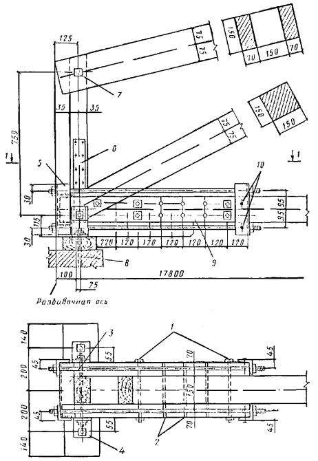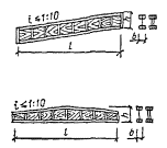 ПРИЛОЖЕНИЕ 4РЕКОМЕНДАЦИИ ПО РАСЧЕТУ ПЛОСКИХ ДЕРЕВЯННЫХ КОНСТРУКЦИЙ НА МОНТАЖНЫЕ СИЛОВЫЕ ВОЗДЕЙСТВИЯ1. Сквозные плоские деревянные конструкции типа стропильных ферм, пологих арок, с затяжкой, монтируемые в целом виде, должны проверяться расчетом на монтажные силовые воздействия, в соответствии с принятой для них в проекте схемой оснастки и захвата и с соблюдением требований пп. 5 и 6 в отношении предельных значений гибкости из рабочей плоскости. В расчете следует учитывать три стадии монтажа: первую - при кантовке собранной конструкции из горизонтального в вертикальное положение, для которой необходимо проверить надежность пояса и стыковых соединений при выгибе конструкций из рабочей плоскости; вторую - при подъеме конструкции в вертикальном положении, когда она, как правило, работает по двухконсольной балочной схеме с изменением знака усилия в поясах по сравнению с основным расчетным случаем нагружения; на этом этапе, если оба пояса фермы жесткие, нижний пояс вместо растяжения испытывает сжатие и должен быть проверен на устойчивость из плоскости конструкции, верхний же пояс при подъеме вместо сжатия работает на растяжение и необходима проверка в нем стыковых соединений. Если же нижний пояс гибкий, например, в металлодеревянных фермах, то при подъеме с помощью траверсы он выключается из работы, а верхний пояс при этом работает на изгиб и наиболее опасным оказываются стыковые соединения в нем; третью - при установке конструкции на опоры и закреплении ее в вертикальном рабочем положении временными гибкими или жесткими связями, когда конструкция работает по основной рабочей схеме, но с меньшим числом точек закрепления верхнего пояса из плоскости; чем это предусматривается постоянными связями жесткости. 2. Расчетной нагрузкой при монтаже является нагрузка от собственного веса конструкции (с учетом коэффициента перегрузки), которая для ферм и балок принимается равномерно распределенной по всему пролету. Так как динамический коэффициент монтажной нагрузки и коэффициент повышения расчетного сопротивления на ее кратковременность по своей величине одинаковы и равны 1,2, то расчет ведется на статическую нагрузку от собственного веса без повышения расчетных сопротивлений. Таблица 38 Зависимость ширины сечений деревянных элементов от пролета конструкций