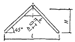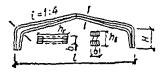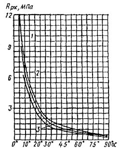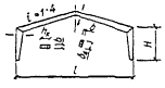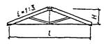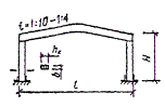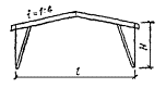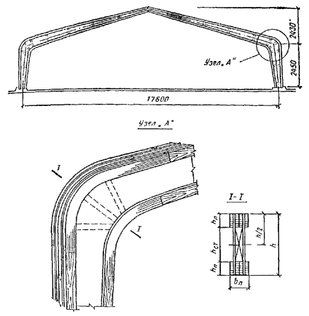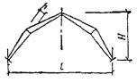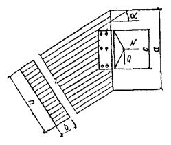 = 0,5[σx + σy + где σx - нормальные напряжения вдоль волокон; σy = σq + σр - суммарные нормальные напряжения поперек волокон; σq = q/(2b) - напряжения поперек волокон от равномерно распределенной нагрузки q на уровне нейтральной оси; σр = -4Pcos4 (arctg (2x/hx))/(πbhx) - напряжения поперек волокон от опорного давления и сосредоточенных сил на уровне нейтральной оси; τxy - скалывающие напряжения на уровне нейтральной оси в балках с постоянной высотой определяются по СНиП II-25-80, п. 4.10, а в балках с переменной высотой - по формуле τxy = 3(Qx - iMx/hx)/(2bhx), Рис. 26. График зависимости расчетных сопротивлений растяжению (МПа) клееной древесины сосны и ели от угла наклона к волокнам для 1, 2 и 3 сортов Рис. 27. Гнутоклееные балки а) постоянной высоты; б) переменной высоты где i - уклон верхней грани балки; α - угол, определяющий направление главных растягивающих напряжений; вычисляется по формулам: при σx - σy ≥ 0 α = 0,5arctg [2τxy/(σx - σy)]; при σx - σy < 0 α = 0,5{180° + arctg [2τxy/(σx - σy)]}; Rрα - расчетное сопротивление древесины растяжению под углом к волокнам α; принимается по графику рис. 26; x - расстояние от оси опорной площадки до проверяемой точки по горизонтали; y - расстояние от нейтральной оси сечения до проверяемой точки по вертикали; положительные значения принимает ниже нейтральной оси; b - ширина балки; h0, hx - высота балки на опоре и в сечении x; Qx, Mx, Jx - поперечная сила, изгибающий момент и момент инерции балки в сечении x. 6.16. Двускатные гнутоклееные балки с постоянной и переменной высотой поперечного сечения и криволинейным участком в средней части пролета (рис. 27) рекомендуются при уклонах 10 - 25 %. Одна из опор в таких балках независимо от пролета должна быть подвижной во избежание возникновения распора. Расчет гнутоклееных балок переменной высоты производится в приведенном ниже порядке. Определяются максимальный изгибающий момент и опорные реакции. Предварительно задается ширина сечения b и назначается длина криволинейного участка l1 = (0,1 - 0,3)l. Назначается уклон нижней грани i2, равный или несколько меньший уклона верхней грани i1 (на величину не более 7 - 10 %). Вычисляются углы наклона граней балки γ и φ и радиус кривизны нижней грани r0. В случае, если уклоны граней заданы в %, γ = arctg 0,01i1, r0 = l1(2sin φ). φ = arctg 0,01i2. Выбирается толщина досок для гнутоклееных конструкций и назначается коэффициент mгн в соответствии с СНиП II-25-80, п. 3.2, ж. Рекомендуется принимать отношение rк/a ≥ 500, тогда коэффициент mгн = 1 для всех видов сопротивлений. Определяется предварительно высота балки в середине пролета из условия восприятия изгибающего момента (см. рис. 27) h = принимая в первом приближении b ≥ 12 см, mб ≈ 0,85 и Kи = 1,3, где Kи - коэффициент, учитывающий кривизну криволинейного участка и уклон верхней грани. При заданном уклоне кровли вычисляется значение высоты балки на опоре h0 = h1 - 0,5l(tg γ - tg φ), где h1 = h - 0,5l1tg φ + r0(1 - cos φ). Положение расчетного сечения для проверки нормальных напряжений изгиба определяется по формуле x = lh0/(2h1). Если определенное по этой формуле расчетное сечение находится в пределах прямолинейной зоны балки, то далее в этом сечении производится проверка нормальных напряжений изгиба как в прямолинейных двускатных балках. Если же расчетное сечение находится в пределах криволинейной зоны, то расчет следует производить с учетом уточнения высоты балки в этом сечении из-за искривленности нижней грани hx = h - r0[cos (γ - φx)/cos γ - 1], где 