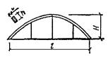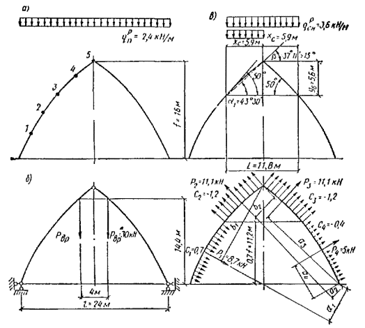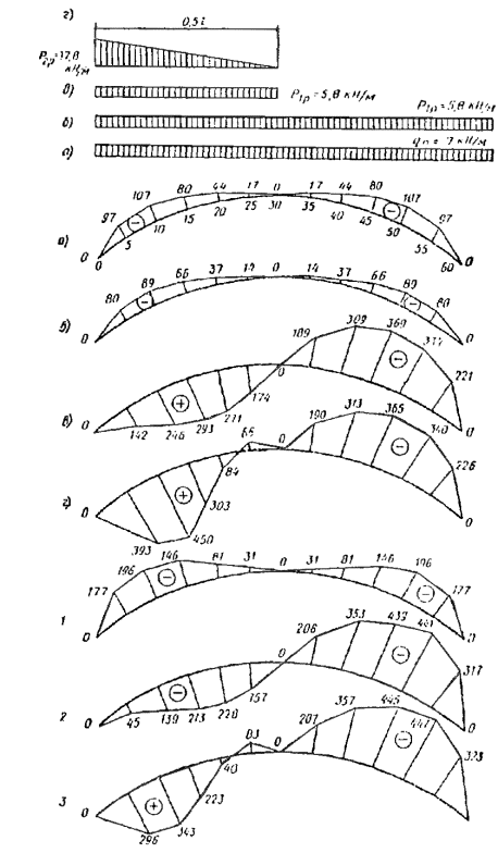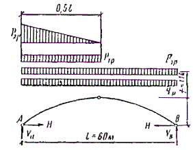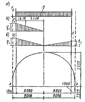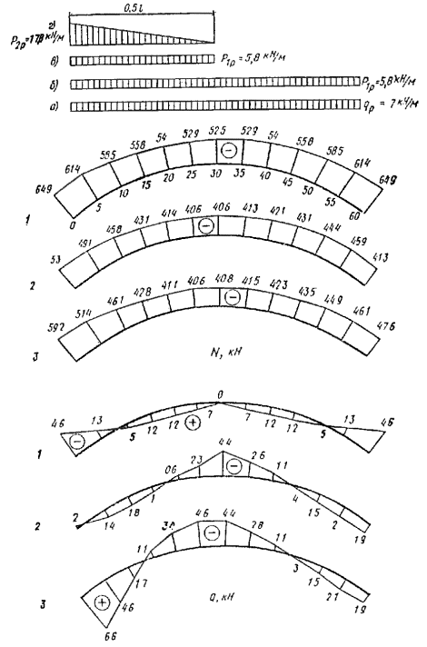 Нагрузки Постоянные расчетные нагрузки на 1 м2 горизонтальной проекции покрытия определяются с введением коэффициента перегрузки n в соответствии со СНиП II-6-74, пп. 2.2. Нормативные нагрузки умножаются на коэффициент k = S/l = 64,4/60 = 1,07, учитывающий разницу между длиной дуги арки и ее проекцией. Вес снегового покрова для III района P0 = 1 кН/м2 горизонтальной проекции; коэффициент c1, учитывающий форму покрытия, в соответствии со СНиП II-6-74, табл. 5, п. 5.5 будет равен: c1 = l/(8f) = 60/(8×11) = 0,682; тогда нормативная равномерно распределенная снеговая нагрузка Pнсн = P0×c1 = 1×0,682 = 0,682 кН/м2. Собственный вес арки в зависимости от нормативного веса кровли и снега определим по формуле прил. 2 gнсв = (gнп + Pнсв)/[1000/(Kсвl) - 1] = (0,594 + 0,682)/[1000/(4×60) - 1] = 1,276/3,16 = 0,404 кН/м2. Сбор постоянных нагрузок арочного покрытия приведен в табл. 27. Полная нормативная нагрузка от собственного веса gн = 0,998 кН/м2 горизонтальной проекции. Отношение нормативного собственного веса покрытия к весу снегового покрова gн/P0 = 0,998/1 = 0,998; коэффициент перегрузки n = 1,41 (СНиП II-6-74), тогда расчетная снеговая нагрузка на 1 м2 горизонтальной проекции покрытия P1 = P0nc1 = 1×1,41×0,682 = 0,962 кН/м2. Таблица 27