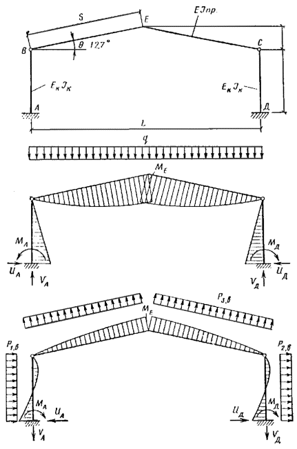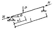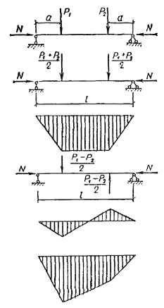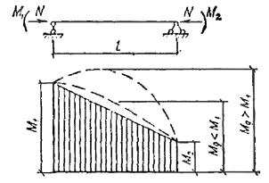 Для определения величины деформационного момента Mд вместо формулы Mд = βнM/ξ, в которой коэффициент, учитывающий схему поперечной нагрузки, введен в числитель, в нормах соответствующий коэффициент перенесен в знаменатель и принята формула Mд = M/(Kнξ), (16) где коэффициент Kн = αнξ(1 - αн) вводится прямым образом к ξ, что логичнее. Выражение для Kн по структуре аналогично выражению для βн. Значения самих коэффициентов m и α (табл. 16), βн и Kн связаны между собой αн ≈ 1/m; Kн ≈ 1/βн. Коэффициенты αн и Kн находятся из приближенной зависимости с погрешностью, не превышающей 3 % для αн и 1,5 % - для Кн. 4.12. При разложении несимметричной нагрузки на симметричную C и кососимметричную K составляющие, соответствующие им формы деформирования, выражаются в виде одной и двух полуволн с гибкостями λс = l/r, λк = l/(2r) и одинаковой сжимающей силой Nс для определения коэффициентов ξс и ξк. Здесь l - длина всего стержня, шарнирно закрепленного по концам; r - радиус инерции поперечного сечения в плоскости деформирования. Рис. 5. Пример разложения несимметричной схемы нагружения на симметричную и кососимметричную Рис. 6. Расчленение разнозначной эпюры моментов Если коэффициенты αнс ≠ 1 и αнк ≠ 1, то формула (32) СНиП II-25-80 принимает следующий вид Mд = Mс/(Kнсξс) + Mк/(Kнкξк). (17) Когда в пределах каждой половины кососимметричного нагружения сохраняется асимметрия, производить дальнейшее разбиение на C и K не следует, так как возникающая при этом погрешность незначительна. Пример разложения несимметричной схемы нагружения на C и K показан на рис. 5, значения коэффициентов αнс и αнк приняты по табл. 16. При разнозначной эпюре моментов она расчленяется на плюсовую и минусовую, а затем, если одна из них или обе несимметричные, производится их разделение на C и K (рис. 6.) 4.13. Для решения задачи в случае постоянной сжимающей силы по длине стержня, шарнирно закрепленного по концам, применим принцип суперпозиции. Значение момента M для расчетного сечения в пролете при этом условии выражается в виде алгебраической суммы его составляющих Mд = Сжимающая осевая сила N при шарнирном закреплении стержня по концам не влияет на величины опорных моментов и они не будут изменяться. Для расчетной схемы по рис. 6 момент в пролете Mд = -M1/(Kн1ξс) + M2(l/2 - x)/(Kн2ξкl/2) + Mx/(Kизξс), где M1 = (MА + MВ)/2, MА > MВ; M2 = (MА - MВ)/2; Mx = qx(l - x)/2; используя формулу (31) СНиП II-25-80 и коэффициенты из табл. 16, находим Kн1 = 0,81 + 0,19ξс; Kн2 = 1,62 - 0,62ξк; Kиз ≈ 1; ξс = 1 - λ2сN/(3000RсF); ξк = 1 - λ2кN/(3000RсF); λс = l/r = 2λк. 4.14. При расчете сжато-изгибаемых стержней, заделанных одним или обоими концами, необходимо учитывать упругость их защемления. Это объясняется невозможностью обеспечить для деревянных элементов жесткое защемление из-за возникающих напряжений смятия поперек волокон и соответствующих им больших деформаций, а также других причин, приводящих к повороту торцового сечения. Данное обстоятельство учитывается при расчете на устойчивость центрально сжатых элементов путем увеличения значений коэффициента μ0 (см. п. 4.21 СНиП II-25-80). Опорные моменты в стержне i - j с упругим защемлением обоих концов равны Mi = mi(βM0j + KjM0i)/[2(KiKj - β2)]; (19) Mj = mj(βM0i - KiM0j)/[2(KiKj - β2)]. Опорный момент в стержне i – j с упругим защемлением одного i-го конца следует определять по формуле: В формулах (19) и (20) приняты следующие обозначения: M0 - опорный момент при жестком защемлении определяется: при действии поперечной нагр