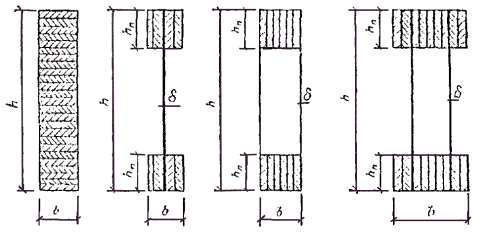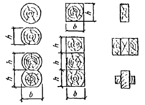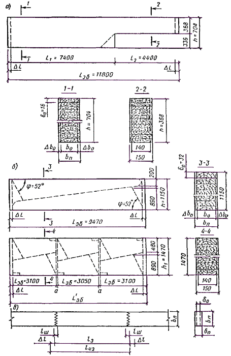 Рис. 69. Заготовочные блоки а) для ригеля; б) для стойки; в) для отдельных слоев Перевозка рам до объекта осуществляется автотранспортом на «приведенное» расстояние - 300 км с учетом структуры автодорог по категориям. Изготовление конструкций предполагается в специализированном цехе, оснащенном комплектным отечественным оборудованием, выпускающим широкую номенклатуру конструкций и входящим в состав крупного деревообрабатывающего комбината. При определении показателей учтена разница в затратах на смежные элементы (связи, элементы из досок для устройства карнизного узла рам ДГР и др.). Подсчет дополнительных затрат для краткости не приводится. Определяем ТЭП вариантов. 1. Расход пиломатериалов Vп = k0Vд = k1k2k3k4V3б = k1k2k3k4k5k6Vд, где k0 - суммарный коэффициент отходов пиломатериалов, равный произведению коэффициентов, учитывающих отходы пиломатериалов при следующих технологических операциях: k1 - раскрое на черновые заготовки; k2 - сращивании по длине; k3 - строжке пластей; k4 - склеивании по ширине; k5 - строжке боковых поверхностей заготовочных блоков; k6 - торцовке и опиловке по шаблону заготовочных блоков (рис. 69). В расчетах на стадии проектирования можно принять: k1 = 1,13; k2 = 1,02; k3 = 1,37 и 1,25 при толщине слоев после строжки соответственно 15 и 33 мм; коэффициент k4 = 1 + 0,15αш, где αш - доля заготовок, склеенных по ширине, в объеме конструкции в деле принимает значения 0 при ширине до 14 мм, 0,3 при ширине 15 - 20 мм и 1 при ширине св. 20 мм. Коэффициент k5 = b0/b (см. рис. 69). Коэффициент k6 принимает значения: 1,02 для прямолинейных элементов постоянного сечения, 1,11 для элементов рам РДП, 1,03 для криволинейных арок типа ДСА, 1,07 для гнутоклееных рам ДГР, 1,15 для двускатных балок. Vд, V3б - объем конструкции соответственно в деле и в заготовочном блоке, м3; Vn1 = 1,13×1,02×1,37×1×1,07×1,07×Vд1 = 1,81×1,76 = 3,18 м3; Vn2 = 1,13×1,02×1,25×1×1,07×1,11Vд2 = 1,71×1,94 = 3,32 м3; соответственно на 1 м2 площади плана V'n1 = 3,18×29/1512 = 0,061 м3/м2; V'n2 = 3,32×29/1512 = 0,064 м3/м2. 2. Расход клея Pk = kп[(Р1 + Р2 + Р3)Vзб + Р4Vд] = kп{[(g1(nс - 1)/(δ0nс) + 1,5k3 + 4αшk3]k5k6 + Р4]}Vд, где kп = 1,05 - коэффициент, учитывающий потери клея в производстве; P1, P2, P3 - расход клея при нанесении его на: пласти заготовок, зубчатые шипы при сращивании заготовок по длине и кромки заготовок при склеивании их по ширине, кг/м3; P4 = 1,2 - расход клея на зубчатый стык в карнизном узле рам РДП, кг/м3; g1 = 0,4 - суммарный удельный расход клея при нанесении его на пласти заготовок, кг/м2 площади клеевого шва; nс - количество слоев по высоте сечения заготовочного блока; k3, k5, k6 - коэффициенты, учитывающие отходы клея при механической обработке заготовок. Pk1 = 1,05{[(0,4(36 - 1)/(0,016×36) + 1,5×1,37]1,07×1,07}Vд1 = 31,7×1,76 = 55,8 кг; Pk2 = 1,05{[0,4(38 - 1)/(0,032×38) + 1,5×1,25]1,07×1,11 + 1,2}Vд2 = 19×1,94 = 36,8 кг. 3. Расход лакокрасочных составов Pэ = gэF, где gэ - суммарный удельный расход эмали, кг/м2, при окраске за 2 раза, gэ = 0,35 кг/м2; F - площадь окрашиваемой поверхности м2; Pэ1 = 0,35×29 = 10,2 кг; Pэ2 = 0,35×33 = 11,6 кг. 4. Трудоемкость изготовления Tи = kВ[(tk + tз + αшtш + tн.к)Lс + (kиtи + k0t0)h1Lзб + kо.кtо.кF + tтрVзб + tклPкл + ΣTi], где kВ = 1,1 - коэффициент, учитывающий трудоемкость вспомогательных операций; t1 - затраты труда, чел.-ч на первичную единицу измерения объема работ, соответственно на следующие технологические операции: tk - предварительную калибровку пиломатериалов; tз - обработку пиломатериалов на линии раскроя сращивания заготовок по длине с помощью зубчатого шипа, строжки пластей, раскроя на заготовки требуемой длины и 