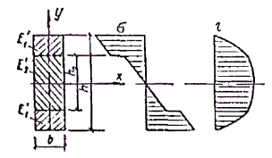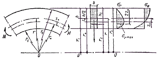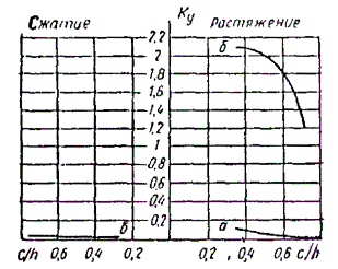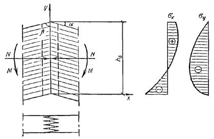 Nкр = φэRсF и Формула (35) строго справедлива при n = 1 для элементов постоянного сечения с подкрепленной кромкой, находящихся в условиях сжатия и чистого изгиба (N = const; M = const) и при n = 2 для элементов постоянного сечения без промежуточных подкреплений, находящихся при тех же условиях. Так как задачи плоской формы деформирования решены в упругой постановке, то коэффициенты φэ и φм могут принимать значения больше единицы. Если φэ > 1 и φм > 1, то проверка устойчивости плоской формы деформирования не требуется. Когда же только один из коэффициентов больше единицы, такая проверка необходима с подстановкой в формулу (33) СНиП II-25-80 вычисленных значений φэ и φм. Значения коэффициента φэ для любой гибкости определяются по формуле φэ = 3000/λ2. Внецентренно сжатые и сжато-изгибаемые элементы должны проверяться на устойчивость из плоскости изгиба на действие только сжимающей силы N (СНиП II-25-80, пп. 4.2, 4.3), если гибкость из плоскости изгиба λy < 70 и напряжение от сжатия выше напряжения от изгиба σс > σи. Определение прогибов изгибаемых деревянных элементов4.27. При определении прогиба изгибаемых элементов, согласно п. 4.33 СНиП II-25-80, необходимо учитывать влияние деформаций сдвига от податливости соединений в случае составного сечения и от касательных напряжений при сплошном сечении. В дощатоклееных двускатных балках, кроме того, надо учитывать влияние переменной жесткости. В клеефанерных плитах и панелях, согласно СНиП II-25-80 п. 4.34 к жесткости EJ вводится понижающий коэффициент 0,7, который не распространяется на клеефанерные балки, рассчитываемые по СНиП II-25-80, п. 4.33. Особенности расчета гнутоклееных элементов4.28. Различают гнутоклееные деревянные элементы с большим и малым отношением радиуса кривизны r к высоте сечения h. В первом случае эпюра тангенциальных нормальных напряжений изгиба близка к треугольной форме и нейтральная ось практически совпадает с центральной, а кроме того, возникают ограниченные по величине радиальные растягивающие или сжимающие напряжения. Момент, уменьшающий кривизну, вызывает растягивающие напряжения поперек волокон, а увеличивающий кривизну - сжимающие. 4.29. При проверке радиальных напряжений в криволинейных элементах, когда r/h > 7 (рис. 8), по формуле (21) СНиП II-25-80 σri = (σ0 + σi)hi/(2ri) ≤ Rр90, если учесть, что на уровне нейтральной оси σi = 0, hi = h/2, ri = r, σ0 = 6M/(bh2), то после подстановки в (21) получаем формулу для максимального радиального напряжения σrмакс = 3M/(2rbh) ≤ Rр90 (Rс90). (36) Рис. 8. Геометрические характеристики и эпюры радиальных и тангенциальных нормальных напряжений гнутоклееного элемента При отношении r/h ≤ 7 нейтральная ось смещается в сторону внутренней кромки, а нормальные напряжения в тангенциальном и радиальном направлениях становятся асимметричными. Формула (36) заменяется формулой σrмакс = (M/Fz0)[r0/r1 - 1 - ln (r0/r1)] ≤ Rр90; (37) z0 = J/(Fr); r0 = r - z0; r1 = r - h/2; для прямоугольного сечения (см. рис. 11) F = bh; z0 = h2/(12r); тангенциальные нормальные напряжения σθi в любом слое таких элементов определяются по формуле σθi = M(r0 - ri)/(Fz0ri), где r - радиус кривизны бруса по центральной оси сечения; r0 - радиус кривизны по нейтральной оси; ri - радиус кривизны рассматриваемого волокна. 4.30. В клеефанерных балках допускаются участки большой кривизны при изгибающих моментах любого знака. Это обеспечивается более высоким сопротивлением фанеры растяжению в плоскости листа, чем клеено