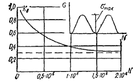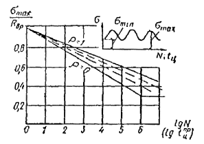 Зависимость между Kв и tцпр, полученная экспериментально, показана на рис. 11. 4.38. При расчете на выносливость изгибаемых элементов из клееной древесины, непосредственно воспринимающих многократно действующие вибрационные и другие виды циклических нагрузок с количеством циклов N ≥ 5×104, к расчетным сопротивлениям изгиба и скалывания при изгибе следует вводить поправочный коэффициент цикличности Kц = Kв/mдл, (39) где Kв = a - blg tцпр - коэффициент выносливости, вводится к кратковременной прочности при стандартных испытаниях линейно-возрастающей нагрузкой элементов из клееной древесины; a, b, c - числовые коэффициенты, зависящие от показателя асимметрии напряжений ρ ≥ 0 и частоты циклов ω, приведенные в табл. 19; mдл = 0,66 - коэффициент перехода от кратковременной к длительной прочности древесины, принятый при нормировании расчетных сопротивлений. Таблица 20