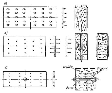 После подстановки в формулу (39) Kв, tцпр и значения mдл получим Kц = 1,52[a - blg (NC/ω)]. (40) Значения коэффициентов Kв и Kц при N ≥ 2×106 следует принимать не ниже указанных в табл. 20 с учетом вида напряженного состояния и показателя асимметрии ρ. 4.39. Расчет на выносливость необходимо производить с соблюдением требований разд. 4 и 6 СНиП II-6-74. Расчетное число циклов N, их частота ω определяются техническими условиями. 4.40. Для клееных деревянных элементов, подвергаемых действию циклических нагрузок, рекомендуется использовать только резорциновые клеи. 5. СОЕДИНЕНИЯ ЭЛЕМЕНТОВ ДЕРЕВЯННЫХ КОНСТРУКЦИЙОбщие указания5.1. Соединения элементов являются важнейшей составной частью деревянных конструкций, от прочности и деформативности которых зависит надежная работа конструкций в целом. Применяются следующие основные виды соединений: на клею, нагелях, шайбах, металлических зубчатых пластинах (МЗП), на врубках. Клеевые соединения должны рассматриваться как жесткие (неподатливые), а соединения на нагелях, на МЗП, на врубках и другие - как податливые. Расчетная несущая способность соединений должна определяться по разд. 5 СНиП II-25-80 в зависимости от типа соединения и его напряженного состояния. Таблица 21