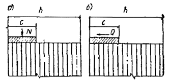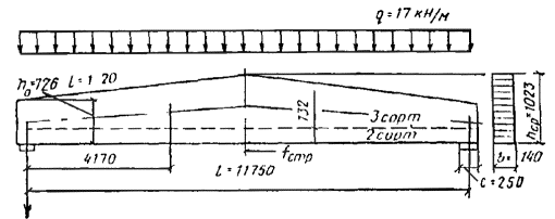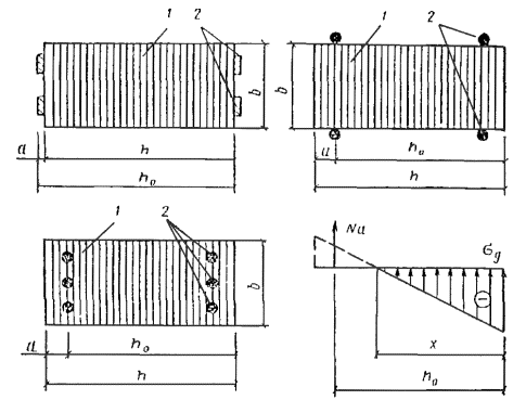 При снеговой нагрузке, распределенной по треугольнику, коэффициент c2 = (2 + 2,2)/2 = 2,1 по интерполяции и P2 = P0nc2 = 1×1,41×2,1 = 2,90 кН/м2. Расчетные нагрузки, приходящиеся на 1 м горизонтальной проекции арки при шаге арок 6 м, находятся: от собственного веса покрытия по табл. 27 qр = 1,164×6 = 7 кН/м; от снега P1р = 0,962×6 = 5,8 кН/м; P2р = 2,96×6 = 17,8 кН/м. Статический расчет арки Схемы нагрузок показаны на рис. 43. Расчет арки производим для следующих сочетаний нагрузок 1) постоянной и снеговой, равномерно распределенной по всему пролету; 2) постоянной по всему пролету и снеговой, равномерно распределенной на половине пролета, 3) постоянной по всему пролету и снеговой, распределенной по треугольнику на половине пролета (СНиП II-6-74, п. 5.3) Определяем усилия в арке при разных схемах нагружения от нагрузки 10 кН/м: Рис. 43. Схема нагрузок от собственного веса и снега, действующих на арку а) от равномерно распределенной нагрузки по всему пролету: вертикальные опорные реакции VА = VВ = l/2 = 60/2 = 300 кН; горизонтальный распор H = l2/(8f) = 602/(8×11) = 410 кН; б) от равномерно распределенной нагрузки на полупролете (слева): вертикальные опорные реакции: VА = 3l/8 = 3×60/8 = 225 кН; VВ = l/8 = 60/8 = 75 кН; горизонтальный распор H = l2/(16f) = 602/(16×11) = 205 кН; в) от распределенной по треугольнику нагрузки на половине пролета (слева): вертикальные опорные реакции VА = 5l/24 = 5×60/24 = 125 кН; VВ = l/24 = 60/24 = 25 кН; горизонтальный распор H = l2/(48f) = 602/(48×11) = 68,2 кН. Значения Mx, Qx и Nx для загружения (п. а) и на участке 0 ≤ x ≤ l/2 (п. б) вычислены по формулам: Mx = VА×x - x2/2 - H×y; Qx = -Hsin φ + (VА - x)cos φ; Nx = Hcos φ + (VА - x)sin φ. На участке l/2 ≤ x ≤ l - по формулам: Mx = VВ(l - x) - Hy; Qx = Hsin φ - VВcos φ; Nx = -Hcos φ - VВsin φ. Для загружения (по п. в) вычисления проводились по формулам на участке 0 ≤ x ≤ l/2: Mx = VА[x - 3,2(l - x)x2/l2] - Hy; Qx = VА[1 - 4,8(l - x)x2/l2]cos φ - Hsin φ; Nx = Hcos φ + VА[1 - 4,8(l - x)x2/l2]sin φ; на участке l/2 ≤ x ≤ l: Mx = VВ(l - x) - Hy; Qx = Hsin φ - VВcos φ; Nx = -H cos φ - VВsin φ. На рис. 44 даны эпюры изгибающих моментов от нагрузок по пп. а, б, в и от сочетания нагрузок по схемам 1, 2 и 3. На рис. 45 даны эпюры нормальных и поперечных сил от сочетания нагрузок по схемам 1, 2 и 3. Вертикальные опорные реакции VА и VВ и распор H для различных схем загружения соответственно равны 384, 384, 523 кН (схема 1); 341, 254, 406 кН (схема 2) и 433, 255, 408 кН (схема 3). Как видно из эпюр, расчетной является схема загружения 3 как по положительным, так и по отрицательным моментам. Максимальный положительный момент имеется в сечениях с абсциссой x = 10 м, а отрицательный - с абсциссой x = 50 м. Расчетные усилия M10 = 343 кН×м; N10 = -461 кН; M50 = -477 кН×м; M50 = -449 кН. Предварительное определение поперечных размеров сечения арок Рис. 44. Эпюры изгибающих моментов в арке от расчетных нагрузок и от их сочетания а) постоянной (собственный вес арки); б) снеговой, равномерно распределенной по всему пролету; в) снеговой, равномерно распределенной на половине пролета; г) снеговой, распределенной по треугольнику на половине пролета; 1 - постоянной (а) и снеговой (б); 2 - постоянной (а) и снеговой (в); 3 - постоянной (а) и снеговой (г) Рис. 45. Эпюры нормальных (N) и поперечных (Q) сил в арке от сочетания расчетных нагрузок 1 - постоянной (а) и снеговой (б); 2 - постоянной (а) и снеговой (в); 3 - постоянной (а) и снеговой (г) Подбор сечения арки Предварительное определение размеров поперечного сечения арок производим по СНиП II-25-80, п. 4.17, формула (28): N/Fрасч + Mд/Wрасч ≤ Rс. Приняв h/b = β, получим h3 - βNh/Rс - 6βM/(ξRс) = 0. (47) Уравнение (47) приводим к виду h3 + 3ph + 2q = 0, (48) где p = -βN/(3Rс); q 