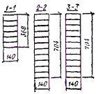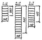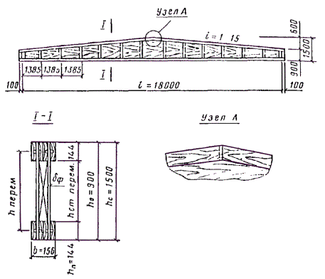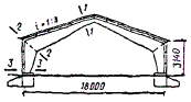 + α = 0,5arctg (2τст/σст) = 0,5arctg (2×2,4/3,3) = 27,5° по графику на рис. 17 (СНиП II-25-80, прил. 5). Для проверки устойчивости фанерной стенки в опорной панели балки вычисляем необходимые геометрические характеристики: длина опорной панели a = 1,3 м (расстояние между ребрами в свету); расстояние расчетного сечения от оси опоры x2 = 0,7 м; высота фанерной стенки в расчетном сечении hст = (0,9 + 0,7×0,0667) - 2×0,144 ≈ 0,66 м hст/δф = 660/12 = 55 > 50; γ = a/hст = 1,3/0,66 ≈ 2. По графикам на рис. 18и 19 прил. 5 для фанеры ФСФ и γ = 2 находим Kи = 15 и Kτ = 2,5. Момент инерции и статический момент для расчетного сечения x2, приведенные к фанере Iпр = 74×108 мм4; Sпр = 8,4×106 мм3. Изгибающий момент и поперечная сила в этом сечении M = qx2(l - x2)/2 = 7×0,7(18 - 0,7)/2 = 42,4 кН×м; Q = q (l/2 - x) = 7(18/2 - 0,7) = 58,1 кН. Нормальные и касательные напряжения в фанерной стенке на уровне внутренней кромки поясов σст = M0,5hст/Iпр = 42,4×106×0,5×660/74×108 = 1,9 МПа; τст = QSпр/(IпрΣδф) = 58×103×8,4×106/(74×108×2×1012) = 2,75 МПа. По СНиП II-25-80 формула (48) проверяем выполнение условия устойчивости фанерной стенки: а) в опорной панели σст/[Kи(100δ/hст)2] + τст/[Kτ(100δ/расч)2] = 1,9/[15(100/55)2 + 2,75/[2,5(100/55)2] = 0,38 < 1, где hст/δ = 55; б) в расчетном сечении с максимальными напряжениями изгиба (x = 6,9 м) при hст/δ = 1,21/0,012 = 101 > 50; γ = a/hст = 1,3/1,22 = 1,07, Kи = 20 и Kτ = 3,5. Напряжения изгиба в фанерной стенке на уровне внутренней кромки поясов σст = Mx0,5hст/Iпр = 268,1×106×536/181×108 = 7,9 МПа, где Iпр = 181×108 мм4; τст = QxSпр/(IпрΣδф) = 14,7×103×12,8×106/(181×108×2×12) = 0,43 МПа, где Q = q(l/2 - x) = 7(18/2 - 6,9) = 14,7 кН, S = 12,8×106 мм3. Используя СНиП II-25-80, формула (48), получим 7,9[20(100/101)2] + 0,43[3,5(100/101)2] = 0,53 < 1. Производим проверку фанерных стенок в опорном сечении на срез в уровне нейтральной оси и на скалывание по вертикальным швам между поясами и стенкой в соответствии со СНиП II-25-80, пп. 4.27 и 4.29. Момент инерции и статический момент для опорного сечения, приведенные к фанере, определяем как и ранее Iпр = 65,5×108 мм4; Sпр = 9,1×106 мм3; τср = QmaxSпр/(IпрΣδф) = 7,9×103×9,1×106/(65,5×108×2×12) = 3,65 < Rфср/γn = 6/0,95 = 6,3 МПа; τск = QmaxSпр/(Iпрnhи) = 7,9×103×9,1×106/(65,5×108×4×144) = 0,15 < Rфск/γn = 0,8/0,95 = 0,84 МПа. Прогиб клеефанерной балки в середине пролета определяем согласно п. 4.33 по формуле (50) СНиП II-25-80. Предварительно определяем: f = f0[1 + c(h/l)2]/к, где f0 = 5qнl4(384El) = 5×5,5×1012(384×248×1012) = 30 мм. Здесь EI = EдIд + EфIф = 104×175×108 + 104×0,9×1,2×67,5×108 = 248×1012 Н×мм2 (СНиП II-25-80, прил. 4, табл. 3); значения коэффициентов к = 0,4 + 0,6β = 0,4 + 0,6×900/1500 = 0,76 и c = (45,3 - 6,9β)γ = (45,3 - 6,9×900/1500)2×144×132[2×12(1500 - 144)] = 48,1; тогда f = 30[1 + 48,1(1,5×103/18×103)2]/0,76 = 53 мм и f/l = 53/18×103 = 1/340 < 1/300 (СНиП II-25-80, табл. 16). Рис. 33. Составная брусчатая балка на пластинчатых нагелях Пример 4. Запроектировать балку пролетом 5,8 м, шагом 3 м составного сечения из брусьев на березовых пластинчатых нагелях односкатного покрытия сельскохозяйственного здания (рис. 33). Покрытие холодное, кровля рубероидная с уклоном i = 0,1. Район строительства - III (по снеговой нагрузке). Согласно СНиП II-6-74 нормативная снеговая нагрузка на горизонтальную проекцию покрытия III района при угле наклона ската кровли α ≤ 25 ° и c = 1 равна Pс = 1 кН/м2. Принимая коэффициент собственного веса балки Kсв = 12, определяем нормативную нагрузку от балки на горизонтальную проекцию по формуле (g1 + Pс)/[1000/(Kсвl) - 1] = (0,3 + 1)/[1000/(12×5,8) - 1] = 0,1 кН×м2. Нагрузка от кровли: рубероидная кровля 0,06 кН/м2; диагональный сплошной настил из досок толщиной 3 см (0,03 ´ 1,0 ´ 1,0)6 = 0,18 кН/м2; прогоны кровли 8 ´ 12 см (0,08×0,12×1,0)6 = 0,06 кН/м2; итого 0,3 кН/м2. Полные нагрузки на 1 м балки: нормативная qн = (g1 + gсв + Pс)B = (0,3 + 0,1 + 1)3 = 4,2 кН/м, в том числе постоянная нагрузка ра