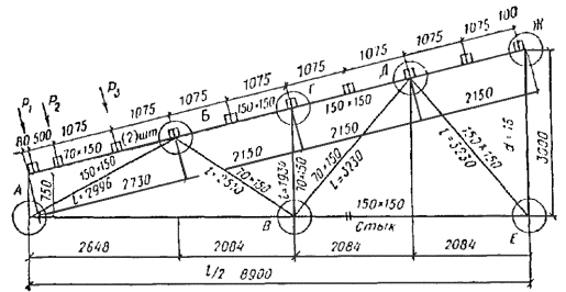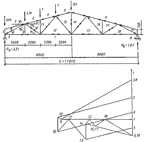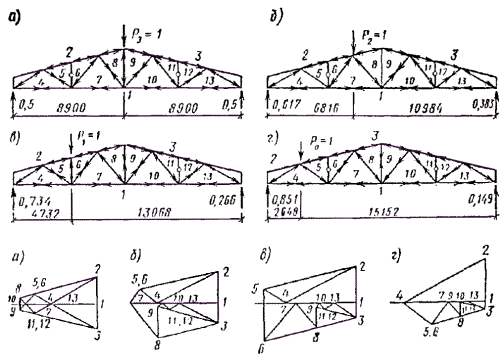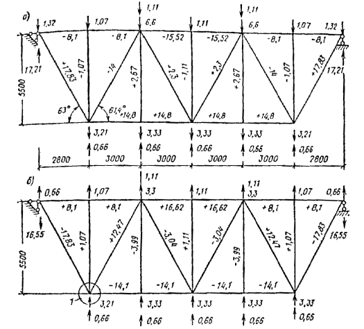 Сопряжение опорного раскоса с верхним поясом осуществляется также лобовым упором. Стыки растянутого нижнего пояса решены на сквозных стальных нагелях и деревянных накладках. Узлы крепления раскосов и стоек к поясам фермы решены в виде двусторонних накладок из полосовой стали, прикрепляемых к поясам посредством центрового болта, а к элементам решетки фермы гвоздями винтовыми или обычными. Рис. 35. Расчетная схема нагружения фермы и диаграмма усилий в ее элементах Расчет верхнего пояса без учета его неразрезности Внеузловая нагрузка от прогонов в панелях 3-10, 4-11, 5-13 равна P = (gп + Pсн)Sпрlпрcos α = (0,323 + 1,59)1,075×3×0,97 = 5,98 кН. Эта нагрузка приложена по середине каждой панели. Изгибающий момент в середине панели M = Pl/4 = 5,98×2,15/4 = 3,21 кН×м. Верхний пояс принимаем из брусьев сечением 150 ´ 150 мм и проверяем его на сжатие с изгибом по СНиП II-25-80, п. 4.17. Расчетные сопротивления древесины 3-го сорта, изгибу, сжатию и смятию согласно СНиП II-25-80, табл. 3, п. 1в Rи = Rс = Rсм = 15/γn = 15/0,95 = 15,8 МПа, где γn - коэффициент надежности по назначению зданий. Для принятого сечения предварительно определяем Wрасч = 150×1502/6 = 562,5×103 мм3; Fбр = Fрасч = 150×150 = 225×102 мм2; λ = l/(0,289h) = 2150/(0,289×150) = 49,6; φ = 3000/λ2 = 3000/49,62 = 1,22; ξ = 1 - N/(φRсFбр) = 1 - 99,5×103/(1,22×15,8×225×102) = 0,77; Kи = αи + ξ(1 - αи) = 1,22 + 0,77(1 - 1,22) = 1,05; N/Fрасч + M/(KиξWрасч) = 99,5×103/225×102 + 3,21×106/(1,05×0,77×562,5×103) = 4,42 + 7,06 = 11,48 < Rс = 15,8 МПа. Проверки устойчивости пояса из плоскости фермы не требуется, поскольку lр = 1,075 ≈ 7b = 7×0,15 = 1,05 м. Панель 2-8 подвержена только изгибу от давления прогонов. Определяем величины нагрузок P1, P2, P3 и опорные реакции от этих нагрузок R1 и R2 в начале и конце панели 2-8 (рис. 36) P1 = P(0,08 + 0,5/2)/1,075 = 5,98×0,33/1,075 = 1,84 кН; P2 = P(0,5/2 + 1,075/2)/1,075 = 5,98×0,7875/1,075 = 4,38 кН; P3 = P = 5,98 кН; R1 = (1,84×2,65 + 4,38×2,15 + 5,98×1,075)/2,73 = 7,55 кН; R2 = 1,84 + 4,38 + 5,98 - 7,55 = 4,65 кН. Рис. 36. Схемы нагружения фермы единичной узловой силой и диаграммы усилий Максимальный изгибающий момент в панели 2-8 будет M = 4,65×1,075 = 5 кН×м. Верхний пояс для этой панели принимаем конструктивно спаренного сечения 2 ´ 70 ´ 150 мм из пиломатериалов 2-го сорта. Проверяем прочность сечения при изгибе M/W = 6×5×106/(2×70×1502) = 9,5 < Rи/γn = 130/0,95 = 13,7 МПа. Расчет верхнего пояса с учетом неразрезности Расчет верхнего пояса фермы производим по схеме неразрезности трехпролетной балки на оседающих опорах. Опорами балки являются узлы фермы. Осадки этих опор определяем по известной формуле строительной механики