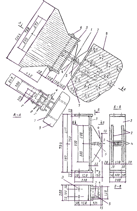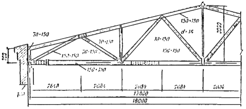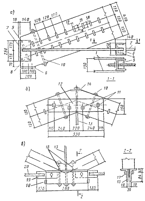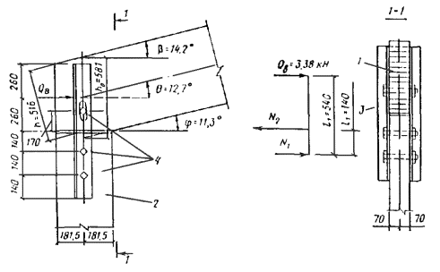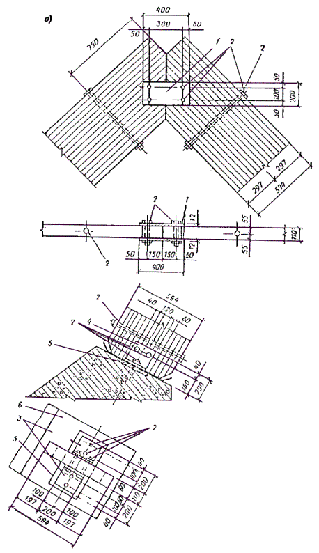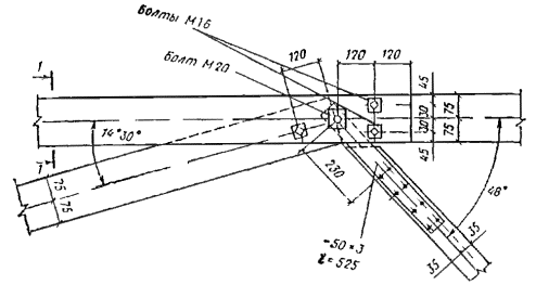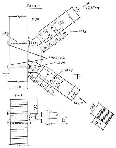 Стык нижнего пояса осуществляем двумя боковыми накладками на нагелях диаметром 16 мм. Согласно СНиП II-25-80 табл. 17, расчетную несущую способность T, кН, цилиндрического нагеля на один шов сплачивания определяем: по смятию среднего элемента стыка T1 = 0,5cd = 0,5×15×1,6 = 12 кН; по смятию крайних элементов стыка T2 = 0,8ad = 0,87×1,6 = 9 кН; по изгибу нагеля T3 = 1,8d2 + 0,02a2 = 1,8×1,62 + 0,02×72 = 5,6 < 250 = 250×1,62 = 6,4 кН. Требуемое количество двусрезных нагелей по одну сторону стыка n = U2(2T3) = 91,9/(2×5,6) = 8,2 шт. Принимаем 10 нагелей, из них 4 нагельных болта для стяжки накладок с поясом. Проверяем прочность стыка U2/Fнт = 91,9×103/1,65×104 = 5,6 < Rр = 5,9 МПа, где Fнт = 2(70×150 - 2×16×70) = 1,65×104 мм2. Расчет элементов решетки Раскос 8-9. Расчетное усилие сжатия Д1 = 96,8 кН, длина раскоса l1 = 3×103 мм. Принимаем сечение 150 ´ 150 мм, Fбр = 2,25×104 мм2; λ = l1/(0,289b) = 300/(0,289×15) = 69,2 < 70; φ = 1 - a(λ/100)2 = 1 - 0,8(69,2/100)2 = 0,617; Д1/(φFбр) = 96,8×103/(0,617×2,25×104) = 6,98 < Rс = 11,6 МПа. Расчетные усилия в раскосе Д3 = 12,45 кН; Д'3 = -4,26 кН; длина l2 = 323 см. Принимаем сечение 70 ´ 150 мм из пиломатериала 2-го сорта и проверяем его на устойчивость Д'3/(φFрасч) = 4,26×103/(0,118×70×150) = 3,44 < Rс = 13,7 МПа. Здесь φ = 3000/λ2 = 3000/1592 = 0,118, λ = l2/(0,289h) = 3,23×103/(0,289×70) = 159 > 150 (табл. 14 СНиП II-25-80). Сечение раскоса не увеличиваем, учитывая значительное его недонапряжение по сжатию, и проверку по растяжению не производим ввиду очевидного запаса. Раскос 9-10 принимаем такого же сечения 70 ´ 150 мм. Раскос 12-13 Расчетное усилие Д4 = -21,82 кН, длина l3 = 3,23×103 мм. Принимаем сечение 150 ´ 150 мм из древесины 3-го сорта и проверяем на устойчивость Д4/(φFрасч) = 21,82×103/(0,539×2,25×104) = 1,8 < Rс = 8,9 МПа, где φ = 3000/λ2 = 3000/74,62 = 0,539; λ = 3,23×103/(0,289×150) = 74,6. Опорную стоику 1-8 и стойку 10-11 принимаем конструктивно сечениями 70 ´ 150 мм из древесины 3-го сорта. Стойка 13-14 Расчетное усилие растяжения V3 = 27,85 кН. Принимаем сечение стойки в виде тяжа из арматурной стали класса А-II диаметром d = 16 мм, Fнт = 140,8 мм2; V3/Fнт = 27850/140,8 = 198 < 0,8Raγс/γn = 0,8×285×0,9/0,95 = 216 МПа, где Ra = 285 МПа расчетное сопротивление арматурной стали А-II; 0,8 - коэффициент уменьшения расчетного сопротивления тяжей; γс = 0,9 - коэффициент условий работы. Расчет и конструирование узлов Маркировка узлов дана на рис. 34. Опорный узел А (рис. 37). Конструируем узел в виде лобового упора раскоса во вкладыш. Вкладыш крепится к нижнему поясу фермы с помощью упора из уголков, стальных тяжей и деревянных боковых накладок, присоединяемых нагелями к нижнему поясу фермы. Проверяем вкладыш на смятие усилием сжатия опорного раскоса Д1 = 96,8 кН. Площадь смятия определяем за вычетом небольшого свеса сечения раскоса, равного 16 мм, который получился при компоновке узла, Fсм = 150×150 - 150×1,6 = 2,01×104 мм2. Угол наклона раскоса к оси нижнего пояса определяем по рис 36: tg α = (0,75 + 2,25×2,648/8,9)/2,648 = 1,42/2,648 = 0,536; α = 28°12'. Напряжение смятия σсм = Д1/Fсм = 96,8×103/2,01×104 = 4,8 < Rсмα/γn = 7,6/0,95 = 8 МПа, где Rсмα - расчетное сопротивление древесины 3-го сорта смятию под углом α = 28°12' к направлению волокон, определяемое по формуле (2) СНиП II-25-80. Боковые накладки принимаем сечением 70 ´ 150 мм. Крепление их к нижнему поясу осуществляем на 10 нагелях диаметром 16 мм, 5 из которых являются болтовыми. Проверяем боковые накладки на сжатие U1/Fнт = 81,8×103/[2(70×150 - 2×16×70)] = 5,13 < Rс = 13,7 МПа. Определяем требуемое сечение растянутых четырех тяжей из арматурной стали А-II. Fнт = U1γn/(Raγсmam) = 84,8×103×0,95/(285×0,9×0,8×0,85) = 457 мм2, где m = 0,85 - коэффициент, учитывающий неравномерную работу тяжей (СНиП II-25-80, п. 3.4). Рис. 37. Конструкции опорного узла «А» брусчат