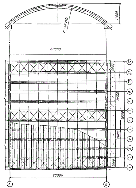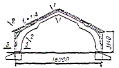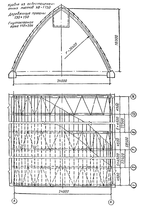 где q = 525×103/750 = 700 Н/мм, тогда длину опорной пластины конструктивно принимаем 750 - 2×110 = 530 ≈ 540 мм. Пример 2. Запроектировать трехшарнирную стрельчатую арку для неотапливаемого склада сыпучих материалов. Исходные данные Арки постоянного сечения, пролет l = 24 м, стрела подъема f = 6 м > l/6 при шаге 4,5 м, опоры железобетонные (рис. 48). Район строительства III по снеговой нагрузке и I по скоростному напору ветра. Ограждающая часть покрытия состоит из прогонов с шагом 1,5 м, укладываемых непосредственно на арки. По прогонам устраивается кровля из асбестоцементных листов УВ-1750. Устойчивость арок из плоскости обеспечивается прогонами и деревянными диагональными элементами, которые расположены в торцах здания и через 22,5 м вдоль здания, образуя поперечные связевые фермы. Прогоны прикреплены к верхним граням арок, а в коньке и пятах полуарок поставлены продольные элементы с упором в боковые грани арок. Геометрические размеры оси арки Длина хорды полуарки l0 = Стрелу подъема дуги полуарки принимаем f0 = 1,4 м > l0/15; Длина дуги полуарки