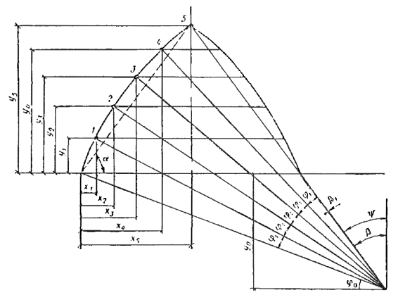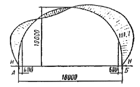 x/ тогда xс = l/2 - (x0 - x50) = 12 - 34 + 27,9 = 5,9 м; yс = y0 + f - y50 = 13 + 16 - 23,4 = 5,6 м; tg α1 = yс/xс = 5,6/5,9 = 0,9492; α1 = 43°30'. Определяем угол β. В выражении y' подставим координату x в вершине арки x = x0 - l/2 = 34 - 12 = 22;