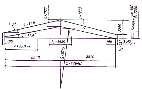 Радиус кривизны оси полуарки r = l20/(8f0) + f0/2 = 202/(8×1,4) + 1,4/2 = 36,4 м. Рис. 48. Поперечный разрез и план здания склада Угол φ раствора полуарки sin (φ/2) = l0/(2r) = 20/(2×36,4) = 0,2747; φ/2 = 15°57'; φ = 31°54'. Угол наклона хорды полуарки к горизонту tg α = f/(0,5l) = 16/(0,5×24) = 1,333; α = 53°08'. Угол φ0 наклона радиуса, проходящего через опору арки, φ0 = 900 - α - φ/2 = 90° - 53°08' - 15°57' = 20° 55'. Рис. 49. Построение геометрической оси арки Для определения расчетных усилий каждую полуарку делим на пять равных частей (рис. 49). Длина дуги и центральный угол, соответствующие одному делению, равны. S1 = S/5 = 20,26/5 = 4,05; φ1 = φ/5 = 31°54'/5 = 6°23'. За начало координат принимаем левую опору, тогда координаты центра кривизны оси полуарки будут равны: x0 = rcos φ0 = 36,4cos 20°55' = 36,4×0,934 = 34 м; y0 = rsin φ0 = 36,4sin 20°55' = 36,4×0,357 = 13 м. Координаты расчетных сечений арки определяем по формулам: xn = x0 - rcos φn; yn = rsin φn - y0, где φn = φ0 + nφ1 (n - номер рассматриваемого сечения). Вычисление координат приведено в табл. 28. Для нахождения зоны L = 2xс, в пределах которой угол наклона к горизонту касательной не превышает 50°, необходимо определить координаты x50 и y50 из уравнения кривой полуарки x2 + y2 = x20 + y20, или после подстановки значении x0 и y0: