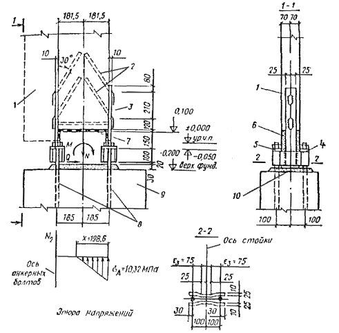 0,02d2) T'2 = 2,5d2 Tмин = 6,57 кН > N2/2 = 6,52 кН. Узел А - сопряжения стойки с фундаментом (рис. 58). Согласно расчетной схеме рамы, сопряжение стойки с фундаментом жесткое. Защемление обеспечиваем двумя металлическими пластинами, которые крепятся к стойке посредством наклонно вклеенных стержней, приваренных к пластинам. Для соединения пластин с анкерными болтами, замоноличенными в фундамент, к ним приварены также траверсы из профилированной листовой стали. К пяте стойки крепится оголовок (стальной, железобетонный, из полимербетона). Между оголовком и торцом стойки размещается гидроизоляционный и выравнивающий слой из клеевой эпоксидной шпатлевки ЭП-00-10. Для обеспечения плотного примыкания вкладыша по всей плоскости его соприкосновения с торцом стойки на заводе-изготовителе производится притяжка вкладыша к стойке при помощи временных траверс и стяжных болтов. После подтяжки болтов производится приварка пластин стойки к вкладышу и демонтаж временной оснастки, которая затем используется для изготовления других стоек рамы. Рис. 58. Опорный узел рамы 1 - стойка; 2 - наклонно вклеенные стержни; 3 - пластина 50 ´ 10; 4 - траверса из полосовой стали 100 ´ 10; 5 - шайба 60 ´ 60 ´ 18; 6 - вкладыш (стальной, железобетонный, из полимербетона); 7 - клеевая прослойка из эпоксидной шпатлевки ЭП-00-10; 8 - анкерные болты М24; 9 - железобетонный фундамент; 10 - подливка из цементного раствора 1:3; 11 - цокольная панель При расчете соединения стойки в пяте с фундаментом используем наиболее невыгодное сочетание нагрузок Mд = 31,98 кН×м; N = 55,8 кН; Q = 5,16 кН. Торец стойки имеет размеры: b = 140 мм; hk = 363 мм. Эксцентриситет приложения продольной силы e = Mд/N = 31,98×106/55800 = 573,1 мм > hk/6 = 363/6 = 60,5 мм. Следовательно, имеет место частичное сжатие (смятие) торца стойки. Высоту сжатой зоны стойки и усилие, приходящееся на пластину, в первом приближении определяем по формулам: x = hk(1 + hk/6e)/2 = 363(1 + 363/6×573,2)/2 = 200,7 мм; Na = N(e - hk/2 + x/3)/( hk + a - x/3) = 55,8(573,1 - 363/2 + 200,7/3)/(363 + 5 - 200,7/3) = 84,97 кН, где a = 5 мм расстояние от центра тяжести пластины до ближайшем грани стойки. Требуемое сечение пластины из стали Вст3пс6-1: Faтреб = Naγn/(Ryγс) = 84970×0,95/(240×0,9) = 374 мм2. Принимаем пластину размером 60 ´ 10 мм. Fa = 60×10 = 600 мм2 и делаем уточняющий расчет. Высоту сжатой зоны определяем из решения кубического уравнения Аx3 + Вx2 + Сx + Д = 0, коэффициенты которого равны: А = -2Nb/3 = -2×55,8×0,14/3 = -5,208 кН×м; В = -2Nb(e - hk/2) = -2×55,8×0,14(0,5731 - 0,363/2) = -6,1185 кН×м2; С = -4NF0n[e + (hk + 2a)/2] = -4×55,8×0,0006×20[0,5731 + (0,363 + 2×0,005)/2) = -2,0344 кН×м3; Д = 4NF0n(hk + a)[e + (hk + 2a)/2] = 4×55,8×0,0006×20(0,363 + 0,005)10,5731 + (0,363 + 2×0,005)/2] = 0,7487 кН×м; n = Ea/Eд = 20. Действительный корень этого уравнения, т.е. высота сжатой зоны древесины равна: x = 0,211 м = 211 мм. Определяем краевые напряжения смятия в древесине и напряжения растяжения в пластине: σд = 2N/b(e + hk/2 + a)/[x(hk + a - x/3)] = 2×55800/140(573,1 + 363/2 + 5)/[211(363 + 5 - 211/3)] = 9,64 МПа < Rсм = 13,9 МПа; σa = N(e - hk/2 + x/3)/[Fa(hk + a - x/3)] = 55800(573,1 - 363/2 + 211/3)/[600(363 + 5 - 211/3)] = 144,3 МПа < Ryγс/γn = 240×0,9/0,95 = 227 МПа. где Ry = 240 МПа - расчетное сопротивление материала пластины - стали Вст3пс6-1 по пределу текучести. Пластину крепим по каждой из двух граней к стойке двумя наклонными стержнями d = 30 мм из арматуры периодического профиля класса А-III, вклеенными под углом β = 30° к продольной оси стойки. Диаметр стержней был определен путем пробных подсчетов исходя из их предельной несущей способности на растяжение и выдергивание. Длина стержня принята l = 35 см и определена графически с учетом обеспечения зазора 