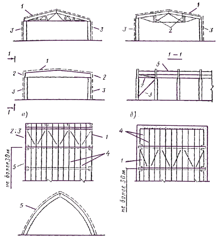 B = 20Fa(N + T)/(bT). Если N1 < N < N2, то прочность сечения обеспечена при Ne ≤ (1/2)bx(h0 - x/3)Rсм, (53) где x = [N - A + 6.54. Высоту сжатой зоны сечения x можно определить из кубического уравнения, используя выражения (50) и (51) для нахождения Fa: Аx3 + Вx2 + Сx + Д = 0, где А = -2Nb/3, В = -2Nb(e0 - h/2); С = -80NFa[e0 + (h ± 2a)/2]; Д = 80NFa[e0 + (h ± 2a)/2](h ± a). Тогда напряжения растяжения при анкерном креплении и краевые напряжения смятия в древесине проверяются по формулам: σa = N(e0 - h/2 + x/3)/[Fa(h0 - x/3)] ≤ Ra; σaFa ≤ Ta; σд = 2N(e0 + h0 - h/2)/[bx(h0 - x/3)] ≤ Rсм. 6.55. Анкерные крепления конструируются по симметричной схеме и предусматриваются со стороны растянутой и сжатой зоны, имея в виду возможную перемену знака момента в процессе монтажа и при эксплуатации. 6.56. При проектировании соединений деревянных клееных колонн с фундаментами на металлических закладных деталях должны учитываться требования огнестойкости и антикоррозионной защиты. Обеспечение пространственной жесткости плоских деревянных конструкций в зданиях и сооружениях6.57. Пространственная неизменяемость и жесткость конструкций в зданиях и сооружениях достигается постановкой связей покрытия и связей между колоннами каркаса в продольном направлении. Связи покрытия должны обеспечивать устойчивость несущих конструкций и их элементов, а также восприятие передающихся через фахверковые колонны горизонтальных нагрузок от ветрового напора на торцовые самонесущие стены. При наличии в здании подвесного подъемно-транспортного оборудования продольные инерционные силы торможения должны быть также восприняты связями покрытия. Рис. 63. Схемы пространственного крепления плоских деревянных конструкций в зданиях и сооружениях каркасного типа (а) и без каркаса (б) 1 - поперечные связи жесткости (связевые фермы); 2, 3 продольные вертикальные связи жесткости; 4, 5 - продольные горизонтальные связи жесткости 6.58. Связевая система покрытия образуется из поперечных связевых ферм - горизонтальных связей в плоскости верхних граней стропильных конструкций, вертикальных связей между ними и продольных элементов, работающих на растяжение или сжатие (рис. 63). Поперечные связевые фермы располагаются по торцевым секциям здания или во второй от торца секции и по промежуточным секциям не реже чем через 30 м, в тех же секциях располагаются вертикальные связи между колоннами. В качестве поясов поперечных связевых ферм следует использовать верхние пояса или все сечение стропильных конструкций. Высота поперечных связевых ферм равна, как правило, шагу стропильных конструкций. В плоскости кровли роль продольных элементов связей, соединяющих элементы жесткости и стропильные конструкции, обычно должны выполнять прогоны или продольные ребра плит. Включение клеефанерных плит в работу не только как продольных элементов связей, но и как составных частей элементов жесткости допустимо при условии обеспечения восприятия усилий, возникающих в сопряжениях плит со стропильными конструкциями. При использовании в качестве несущих конструкций шпренгельных систем вертикальные связи должны раскреплять их растянутый пояс. 6.59. Усилия в связевых фермах, обеспечивающих пространственную жесткость зданий и сооружений, определяются из расчета на действие горизонтальной нагрузки, направленной вдоль здания, и вертикальной нагрузки на покрытие с учетом начальных отклонений формы и положения плос