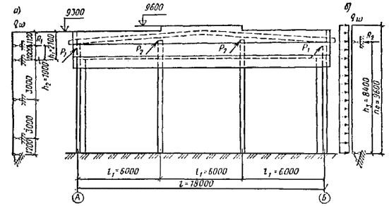 Определяем толщину шайбы анкерного болта, опирающейся на траверсу. Пролет шайбы l = 50 + 10×2/2 = 60 мм, ширина шайбы b = 60 мм. Изгибающий момент от сосредоточенной силы, передаваемый на шайбу анкерным болтом, M = Nal/(2×4) = 86580×60/(2×4) = 649,4×103 Н×мм. Требуемая толщина шайбы из стали марки Вст3пс6-1 hш = Принимаем шайбу толщиной 18 мм. Пример 2. Запроектировать деревянную гнутоклееную раму пролетом 18 м, шагом 3 м для здания спортивного зала (рис. 59). Ограждающие конструкции покрытия - утепленные плиты размером 1,5 ´ 3 м. Кровля - рулонная. Район строительства - Петрозаводск. Нагрузки на 1 м горизонтальной проекции рамы, кН/м: постоянная (от собственного веса рамы и покрытия) нормативная gн = 3,2 и расчетная g = 3,55; временная снеговая нормативная qн = 4,5; расчетная равномерно распределенная q = qнc1 = 4,5×0,5 = 2,25 и распределенная по треугольнику на половине пролета q1 = qнc2 = 4,5×2,2 = 9,9, коэффициенты c1 и c2 соответствуют отношению f/l = 1/4 СНиП II-6-74, табл. 5. Расчетным сочетанием нагрузок, вызывающим максимальный изгибающий момент, является совместное действие нагрузок а и b (рис. 60). Эпюра моментов для данного нагружения представлена на рис. 61. Значение расчетного момента M = 101,7 кН×м, нормальная сжимающая сила в том же сечении N = 69,7 кН. Рис. 59. Схема поперечного разреза здания Боковое действие ветровой нагрузки уменьшает расчетное значение отрицательного момента от собственного веса покрытия со снегом и поэтому не учитывалось. Для принятого эллиптического очертания криволинейной части оси рамы радиус кривизны в расчетном сечении r = 7,31 м. Рис. 60. Расчетная схема рамы с нагрузками (а) постоянная нагрузка от собственного веса; (б, в) снеговая нагрузка Рис. 61. Эпюра расчетных изгибающих моментов Задаемся постоянной высотой сечения рамы h = 630 > l/30 = 18000/30 = 600 мм и шириной сечения b = 140 мм при толщине слоев a = 33 мм, тогда радиус кривизны внутренней кромки в расчетном сечении rk = t - h/2 ≈ 7 м и rk/a = 7000/33 = 210 > 150. По СНиП II-25-80 табл. 7, 8, 9 mб = 0,95; mсл = 1, mгн = 0,92, а расчетное сопротивление изгибу и сжатию вдоль волокон при использовании сосновых пиломатериалов 2-го сорта и введении коэффициента надежности по назначению γn = 0,95. Rи = Rс = 15mбmгн/γn = 15×0,95×0,92/0,95 = 13,8 МПа. Проверку прочности рамы в расчетном сечении при h/r = 0,63/7,31 ≈ 1/11 < 1/7 производим согласно СНиП II-25-80, пп. 4.17 и 6.28 по формуле N/Fрасч + Mд/Wрасч = 69,7×102/8,8×104 + 108,1×106/9,25×106 = 12,5 < Rи = 13,8 МПа, где Mд = M/ξ = 101,7/0,94 = 108,1 кН×м. Так как очертание гнутоклееной рамы с короткими прямолинейными участками приближается к очертанию арки, то, руководствуясь СНиП II-25-80, пп. 4.17 и 6.27, в формулу для определения коэффициента ξ подставляем значение сжимающей силы N0 = 29 кН в ключевом шарнире рамы: ξ = 1 - N0/(φFRс) = 1 - 29×103/(0,425×8,8×104×13,8) = 0,94; Здесь φ = 3000/λ2 = 3000/842 = 0,425; λ = l0/(0,289h) = 0,5s/(0,289h) = 0,5×30,8/(0,289×0,63) = 0,84; s - полная длина контура рамы по центральной оси. При подкреплении внешней кромки полурамы в трех промежуточных точках поперечными и продольными связями жесткости с отношением размеров поперечного сечения рамы h/b = 630/140 ≈ 4,5 проверка устойчивости плоской формы деформирования не требуется ввиду очевидного запаса. Соединение полурам в ключевом шарнире осуществляется лобовым упором с боковыми накладками на болтах. Сопряжение концов рамы с фундаментами в пятах для передачи распора и вертикальной опорной реакции выполняется при помощи сварного башмака из листовой стали. Для обеспечения пространственной жесткост