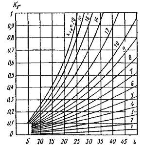 Рис. 70. График определения коэффициента продольного изгиба φ по формулам (7) и (8) СНиП II-25-80 1 - для древесины; 2 - для фанеры ПРИЛОЖЕНИЕ 2ВЕСОВАЯ ОЦЕНКА НЕСУЩИХ ДЕРЕВЯННЫХ КОНСТРУКЦИЙ ПОКРЫТИЙПредварительное определение нагрузки от собственного веса проектируемой несущей конструкции gсв в зависимости от ее типа, пролета l и величины полезной нормативной нагрузки gн + Pнвр производится по формуле gсв = (gн + Pнвр)/[1000/(Kсвl) - 1] = Kг(gн + Pнвр), Kг (грузовой коэффициент) находится по графику рис. 71 в зависимости от коэффициента собственного веса Kсв и пролета l, м. Значения коэффициентов собственного веса для некоторых типов деревянных конструкций: 1. Свободно опертые однопролетные балки: дощатоклееные прямоугольного сечения 7 ¸ 9 клеефанерные 5 ¸ 6 2. Стропильные фермы при внеузловой нагрузке: треугольные деревянные 4,5 ¸ 6 треугольные металлодеревянные 4 ¸ 5 многоугольные деревянные 3,5 ¸ 4,5 сегментные деревянные 3 ¸ 3,5 сегментные металлодеревянные 2,5 ¸ 3 3. Трехшарнирные дощатоклееные арки прямоугольного сечения 2,5 ¸ 4 Рис. 71. График значений грузовых коэффициентов Kг в зависимости от коэффициента собственного веса Kсв и пролета конструкции l, м. Для оценки весовой эффективности запроектированной несущей конструкции следует определить фактический коэффициент собственного веса Kсвфак по формуле Kсвфак = 1000gсвфак/[(gсвфак + gн + Pнвр)l]. ПРИЛОЖЕНИЕ 3ПРАВИЛА* УЧЕТА СТЕПЕНИ ОТВЕТСТВЕННОСТИ ЗДАНИЙ И СООРУЖЕНИЙ ПРИ ПРОЕКТИРОВАНИИ КОНСТРУКЦИЙ* «Бюллетень строительной техники», № 7, 1981 и № 10, 1982. 1. Настоящие правила применяются при проектировании конструкций зданий и сооружений объектов промышленности, сельского хозяйства, энергетики, транспорта, связи, водного хозяйства и жилищно-гражданского назначения, кроме объектов, для которых порядок учета степени их ответственности установлен в соответствующих главах части II СНиП «Нормы проектирования». 2. При проектировании конструкций степень ответственности зданий и сооружений следует учитывать коэффициентом надежности по назначению γn согласно стандарту Совета экономической взаимопомощи СТ СЭВ 384-76 «Строительные конструкции и основания». Степень ответственности зданий и сооружений определяется размером материального и социального ущерба, возможного при достижении конструкциями предельных состояний. 3. На коэффициент надежности по назначению γn следует делить предельные значения несущей способности, расчетные значения сопротивлений, предельные значения деформаций, раскрытия трещин или умножать расчетные значения нагрузок, усилий или иных воздействий. 4. Значения коэффициента надежности по назначению γn устанавливаются в зависимости от класса ответственности зданий и сооружений по прилагаемой таблице. Таблица