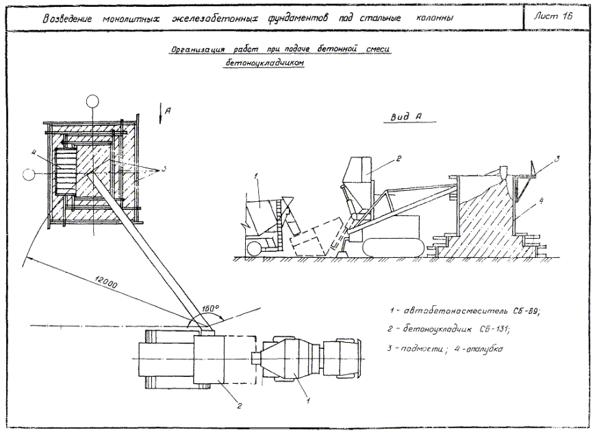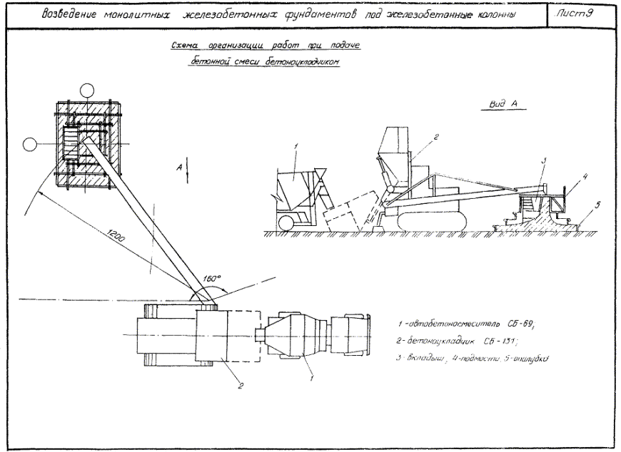 бетонирование фундаментов с помощью крана и бадьи, бетоноукладчика