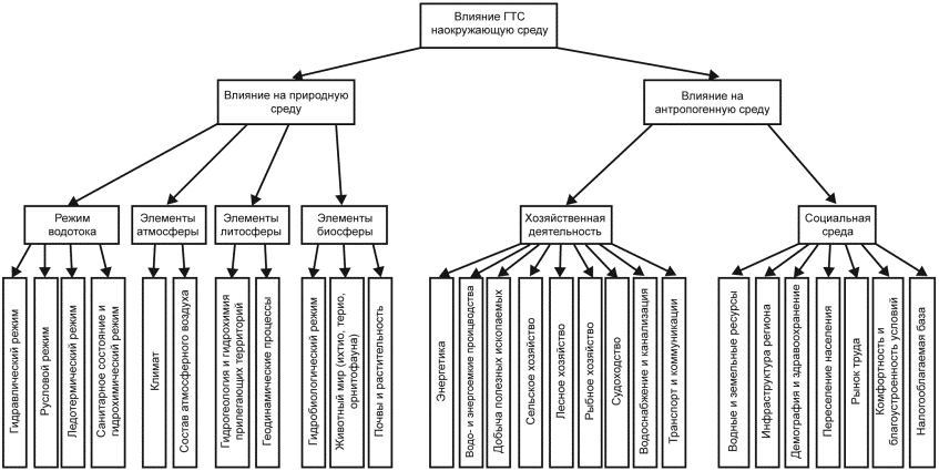 Основные направления воздействия ГТС на окружающую среду Влияние ГТС на окружающую среду может касаться различных компонент природно-технического комплекса: не только элементов природной среды, но и отраслей хозяйства и социально-демографической сферы [1, 37]. На представленной схеме показаны различные аспекты влияния ГТС на компоненты ПТК. В последующих разделах Методических указаний дается описание большинства из указанных на схеме проявлений воздействия ГТС на окружающую среду. При этом очевидные положительные эффекты гидротехнического и, в частности, гидроэнергетического строительства (такие, как введение новых энергетических мощностей, развитие на их основе промышленности и комфортных условий жизнедеятельности, многие другие выгоды, включая несомненные преимущества гидроэнергетики перед другими способами выработки электроэнергии) в настоящем документе не рассматриваются. Основное содержание его посвящено рассмотрению возможных негативных воздействий, проявляющихся в процессе нормальной эксплуатации ГТС и на которые должно быть обращено особое внимание, а их прогнозирование и разработка мер по их снижению и/или нейтрализации должны в соответствии с требованиями СНиП 11-01-95 войти в проект ГТС в качестве одного из важнейших его разделов. При составлении этого раздела проекта следует руководствоваться рекомендациями, содержащимися в Пособии [2] и в настоящем нормативном документе. Основное внимание в Методических указаниях уделено влиянию на окружающую среду гидроузлов, возведенных на реках. Решение многих из рассмотренных вопросов могут быть применены при оценке воздействия на окружающую среду таких специальных видов гидроэнергетических сооружений, какими являются гидроаккумулирующие и приливные электростанции (ГАЭС и ПЭС). Однако в виду отсутствия достаточного для обобщения опыта эксплуатации подобных сооружений их влияние на окружающую среду в Методических указаниях не рассматривается. Также не рассматривается воздействие ГТС на окружающую среду при авариях на них. 1.4. В связи со строительством (реконструкцией) и эксплуатацией ГТС может быть оказано прямое и косвенное влияние на окружающую природную среду с прямыми и косвенными эффектами для нее. Эффекты могут быть положительными и отрицательными, планируемыми и сверхпланируемыми или же побочными, как правило, не учитываемыми при принятии решений. Большое значение для принятия в случае необходимости срочных мер по недопущению нежелательных эффектов или их смягчению имеет (в соответствии с требованиями Федерального закона № 7-ФЗ) организация мониторинга взаимодействия ГТС с окружающей средой. Состав мониторинговых исследований определяется на основании анализа конкретных аспектов влияния ГТС на окружающую природную среду. 1.5. Планируемые эффекты определяются, как правило, на этапе принятия решений при проектировании, ремонтах, реконструкции, консервации либо ликвидации ГТС, побочные эффекты выявляются при эксплуатации (строительстве или проведении ремонтно-восстановительных и пр. работ) в ходе проведения мониторинга, экологического аудита или лицензирования объекта. При принятии решений по ГТС должны рассматриваться различные по методам строительства, компоновке сооружений и глубине регулирования стока варианты, включая так 