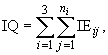 где IVE1 и IVE2 - значения индексов ценности элемента для двух сравниваемых состояний элемента; k1,2=±1 - коэффициент, зависящий от роли (позитивной, негативной) элемента окружающей среды. 8. В качестве интегрального критерия воздействия объекта на окружающую среду принимается интегральный индекс качества состояния окружающей среды (IQ), представляющий собой сумму балльных оценок IE по j-м учитываемым элементам окружающей среды по трем i-м аспектам: