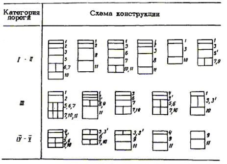 Обочины на дорогах укрепляют в соответствии с указаниями СНиП II-Д.5-72 и «Рекомендациями по укреплению обочин автомобильных дорог» /6/. Дорожная одежда из материалов, не обработанных и обработанных органическим вяжущим 9. Рекомендуемые области применения различных марок и типов асфальтобетона для верхнего слоя дорожного покрытия с учетом категории дороги и климатической зоны указаны в приложении 1 ГОСТ 9128-76. Для условий I - II дорожно-климатических зон на дорогах I и II категорий предпочтительно применять асфальтобетон типа Б и Г. Смеси для устройства верхнего слоя покрытия должны содержать щебень, песок или дробленый песок из труднополирующихся горных пород или специальный искусственный щебень. Требуемую шероховатость обеспечивают также путем поверхностных обработок, устройства ковриков износа и т.п. Нижний слой покрытия устраивают преимущественно из пористого асфальтобетона в соответствии с требованиями ГОСТ 9128-76. Для нижнего слоя покрытия рекомендуется применять смеси с более вязким битумом, чем в верхнем слое. 10. Толщину асфальтобетонного покрытия, устраиваемого из сравнительно дорогих материалов, следует назначать близкой к минимальной конструктивной. При этом необходимо учитывать особенности работы покрытия на основаниях разного типа. Однослойное асфальтобетонное покрытие работает на дорогах с движением автомобилей большой грузоподъемности удовлетворительно только на основании из материалов, обработанных вязкими битумами. В III - V дорожно-климатических зонах на дорогах III - IV категорий с расчетной интенсивностью движения менее 700 проходов автомобилей группы Б в сутки по полосе однослойное асфальтобетонное покрытие допускается укладывать непосредственно на основание из неукрепленного материала. Однослойное асфальтобетонное покрытие с основанием из неукрепленного материала допускается устраивать на площадках для стоянки транспорта, на внутриквартальных проездах, тротуарах и т.п. В остальных случаях асфальтобетонное покрытие следует проектировать двухслойным. На дорогах I и II категорий с интенсивным движением автомобилей большой грузоподъемности (100 -500 автомобилей группы А в сутки по полосе) толщина слоев из материалов, обработанных органическим вяжущим (покрытие и верхний слой основания), как правило, должна быть больше 12 см. 11. Рациональными материалами для устройства верхнего слоя основания под асфальтобетонное покрытие на дорогах I и II категорий являются: горячий щебеночный пористый асфальтобетон, крупно- и среднезернистый, преимущественно III - IV марок; пористые щебеночные смеси с применением эмульсии; горячий гравийный пористый асфальтобетон, крупно- и среднезернистый, с добавлением 26 - 45 % щебня; фракционированный щебень, обработанный вязким битумом способом пропитки. На дорогах III и IV категорий верхний слой основания устраивают из горячего гравийного пористого асфальтобетона, гравийно-песчаной смеси, обработанной битумной эмульсией в сочетании с цементом, гравийной смеси, обработанной битумной эмульсиейх), щебня из естественного камня, гравия или шлака, гравийных смесей с добавлением 30 % щебня. х) «Технические указания по проектированию и применению дорожных эмульсий» ВСН 115-75 М., «Транспорт», 1976. На дорогах V категории основание сооружают из гравийно-песчаных смесей оптимального состава и 