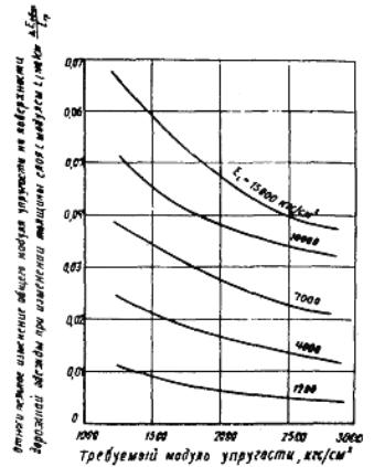 hi - толщина i-го слоя, см; Д - диаметр нагруженной площади, см. 26. (К уточнению п. 3.15 ВСН 46-72). При подборе толщин слоев дорожной одежды по упругому прогибу целесообразно пользоваться номограммой рис. 2. С помощью этой номограммы можно определить, насколько изменится общий модуль упругости одежды на поверхности покрытия при увеличении или уменьшении на 1 см толщины какого-либо слоя с модулем упругости при заданном Emp. Таблица 4 Определяющие критерии прочности