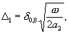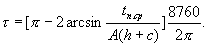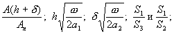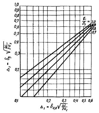где h - толщина слоя, находящегося над теплоизоляцией (общая толщина слоев над теплоизоляцией при многослойной конструкции), м; δ - толщина теплоизолирующего слоя, м; w - частота колебаний температуры, 1/ч; a1, a2 - коэффициенты температуропроводности соответственно материала, находящегося над теплоизоляцией, и теплоизолирующего материала