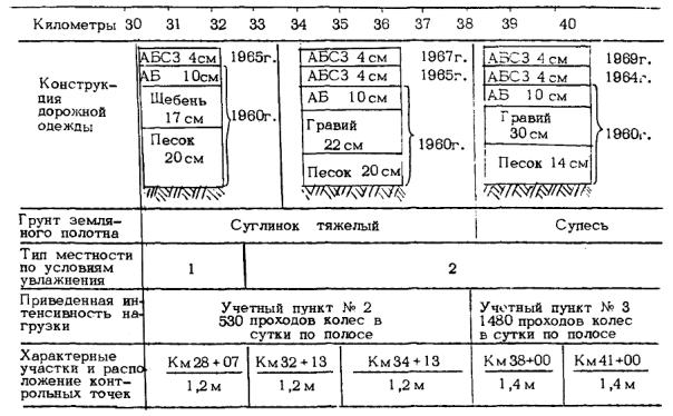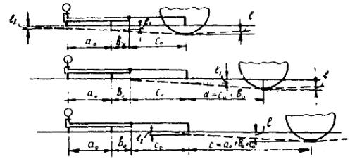 Рис. 9. Сводная ведомость результатов анализа документальных данных о дороге: АБСЗ - асфальтобетон среднезернистый; АБ - асфальтобетон III - IV марки. В знаменателе нижней строки дано расстояние от контрольной точки до кромки покрытия На характерном участке намечают контрольную точку, находящуюся в месте, наиболее полно представляющем картину внешнего состояния дорожной одежды на участке. Контрольные точки нужно назначать в непосредственной близости от хорошо заметных ориентиров (километровые столбы, дорожные знаки и т.п.). Каждую точку фиксируют на покрытии яркой водостойкой краской в виде круга диаметром 10 см и указывают ее координаты в сводной ведомости (рис. 9). Методика проведения испытаний 55. Работу ведет бригада, состоящая из двух звеньев, одно из которых осуществляет испытания на контрольных точках, а другое - в остальных точках по протяжению характерного участка (линейные испытания). Желательно, чтобы начало испытаний на контрольных точках совпало с началом оттаивания грунта, подстилающего дорожную одежду. Для получения данных об особенностях суточного изменения модуля упругости дорожной конструкции на каждой контрольной точке должно быть проведено два испытания: в первой и второй половине дня. Линейные испытания следует начинать, когда по результатам испытаний на контрольных точках станет видна общая тенденция снижения прочности (увеличение изо дня в день прогиба покрытия). Характерный участок должен быть разделен на отрезки длиной от 800 до 1000 м. На каждом отрезке следует провести 20 измерений. В период проведения линейных испытаний и по их окончании продолжают испытания на контрольных точках и не прекращают их до тех пор, пока не станет видна тенденция стабилизации прочности дорожной одежды. Обычно общая длительность испытаний на контрольных точках составляет 30 - 35 дней. При проведении испытаний прогибомером МАДИ-ЦНИЛ для устранения ошибки от попадания опор этого прибора в чашу прогиба поверхности покрытия измерения выполняют следующим образом (рис. 10): а) устанавливают испытательный автомобиль над точкой, где необходимо измерить прогиб; б) прогибомер располагают на покрытии так, чтобы подпятник измерительного стержня опирался на покрытие в центре между шинами заднего сдвоенного колеса автомобиля; автомобиль должен находиться над точкой до тех пор, пока отсчет по индикатору в течение 10 - 15 сек не станет меньше 0,01 мм, и берут этот отсчет i0; Рис. 10. Схема поэтапного определения прогиба покрытия с помощью прогибомера МАДИ-ЦНИЛ в) продвигают автомобиль вперед на расстояние в0 + с0 (см. рис. 10) и берут отсчет id по индикатору; г) продвигают автомобиль на расстояние a0 + в0 + с0 от первоначального положения (см. рис. 10) и берут третий отсчет if по индикатору; д) продвигают автомобиль вперед на расстояние 5 - 6 м от первоначального и затем берут отсчет i по индикатору. Все отсчеты по индикатору записывают в журнал (см. табл. 13). Полный прогиб вычисляют по формуле
