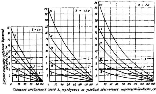 Согласно этому методу, по рис. 1 приложения 2 или по формуле (1) определяют толщину дорожной одежды, обеспечивающую морозоустойчивость конструкции; при этом имеется в виду, что нижний слой основания, выполняющий функции морозозащитного слоя, устроен из песка или гравийно-песчаной смеси. Если морозозащитный слой устраивают из материалов, отличающихся от песка по теплофизическим свойствам (цементогрунт, зологрунт, шлак, укрепленный вяжущим, и др.), то толщина такого слоя выражается через толщину слоя песка (гравийно-песчаной смеси) hпес следующим образом: