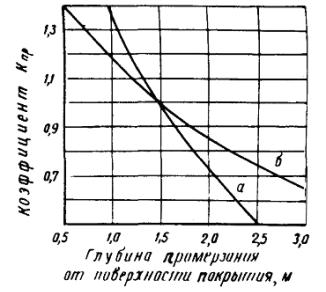смеси): Примеры расчета Пример 1. Необходимо определить толщину морозозащитного слоя дороги с асфальтобетонным покрытием при следующих исходных данных: местность 3-го типа по условиям увлажнения, грунт - тяжелый пылеватый суглинок, расстояние от поверхности проектируемого покрытия по уровня грунтовых вод - 1,0 м; коэффициент уплотнения грунта - kупл = 0,96, влажность грунта - 0,8Wт; глубина промерзания Z = 1,5 м. Согласно классификации грунтов по степени пучинистости (СН 449-72), данный грунт в условиях 3-го типа местности относится к V группе. По рис. 1 приложения 2 установили, что Z1.ср = 90 см; по рис. 2 приложения 2 нашли kн = 0,8; по табл. 1 приложения 2 kп = 1,2; по рис. 3 приложения 2 kпр = 1,0; kст = 1,2 и по табл. 2 приложения 2 kв = 1,2. Рис. 2. Значение коэффициента kн Рис. 3. Значение коэффициента kпр: а - связный грунт; б - несвязный грунт Тогда Z1 = 90 ´ 0,8 ´ 1,2 ´ 1,0 ´ 1,2 ´ 1,2 = 125 см. Для уменьшения толщины Z1 дорожной одежды требуемой по условию обеспечения морозоустойчивости, можно предусмотреть следующие мероприятия. 1. Очень пучинистый грунт земляного полотна заменяют менее пучинистым, например легкой супесью (IV группа по степени пучинистости). Тогда Z1 = 65 ´ 0,8 ´ 1,1 ´ 1,0 ´ 1,1 ´ 1,2 = 75 см, т.е. при обычной, требуемой по условиям прочности, толщине дорожной одежды будет обеспечена и ее морозоустойчивость. 2. Понижают, уровень грунтовых вод, например до H = 2 м. В этом случае kн = 0,6 и Z1 = 90 ´ 0,6 ´ 1,2 ´ 1,0 ´ 1,2 ´ 1,2 = 90 см. Пример 2. В условиях, аналогичных приведенным в примере 1, требуется оценить деформацию морозного поднятия покрытия, если толщина дорожной одежды составляет 60 см. По
