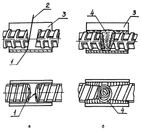 2.3.8. При сварке выпусков арматуры с использованием вставки рекомендуется собрать один из стыков с зазором 0 - 5 мм, произвести прихватку, после чего установить скобу-накладку на второй стык, прихватить ее к выпуску арматуры и вставке и произвести механизированную сварку порошковой проволокой. Затем установить скобу-накладку на первый стык и произвести сварку. Прихватку следует выполнять постоянным током обратной полярности, сила тока 110 - 160 А; в качестве источников питания должны быть применены выпрямители (см. п. 2.3.7). Прихватку допускается выполнять механизированным способом на режимах, приведенных в табл. 5; 6. 2.3.9. В случае выполнения сварки при отрицательной температуре необходимо: повысить сварочный ток на 1 % при понижении температуры на каждые 3 °С; произвести, после установки и прихватки скоб-накладок, предварительный подогрев выпусков арматуры газовой горелкой до температуры 200 - 250 °С на длину 90 - 150 мм от центра стыка (контроль температуры следует осуществлять термоиндикаторными карандашами марки 240 по ТУ 6-10-1110-76); - снизить скорость охлаждения после сварки (сваренные стыки закрыть мягким асбестом). Производить сварку при температуре окружающего воздуха ниже минус 30 °С не допускается. 2.3.10. Для получения стыкового соединения выпусков арматуры следует: при сварке горизонтальных выпусков арматуры возбудить дугу, направив сварочную проволоку в угол, образованный торцом выпуска арматуры и поверхностью скобы-накладки; проплавить нижнюю часть торца выпуска, переместить конец проволоки на нижнюю часть второго выпуска и проплавить ее (направление перемещения проволоки показано на рис. 3, а); после образования ванны жидкого металла и шлака путем быстрых перемещений конца сварочной проволоки по краям ванны постепенно заполнить плавильное пространство (рис. 3, б); при скоплении большого количества шлака, затрудняющего процесс сварки, следует прожечь сварочной проволокой небольшое отверстие на 2 - 5 мм ниже поверхности сварочной ванны, после удаления некоторого количества шлака заварить отверстие и продолжить сварку; в конце сварки с целью избежания усадочной раковины и подрезов стержней рекомендуется сделать 2 - 3 перерыва с интервалом 3 - 4 с; сварочную проволоку при этом следует располагать перпендикулярно выпускам арматуры, не допуская ее приближения к центру плавильного пространства; сварку межторцового пространства следует заканчивать резким обрывом дуги, прекратив подачу проволоки за 2 - 3 с до окончания процесса; после остывания шлаковой ванны отбить корку и заварить фланговые швы; при сварке вертикальных выпусков арматуры после возбуждения дуги в точке А наплавить валиковые швы (рис. 4, а) и, перемещая конец сварочной проволоки, заполнить разделку торцов последовательным наложением валиков (рис. 4, б); перед наложением каждого последующего слоя предыдущий слой наплавленного металла необходимо очистить от шлака и брызг и подвергнуть внешнему осмотру; сварку закончить наплавкой фланговых швов ручной дуговой сваркой. 1 - точка возбуждения дуги; 2 - сварочная проволока; 3 - стальная скоба-накладка; 4 - наплавленный металл Рис. 3. 1 - точка возбуждения дуги; 2 - сварочная проволока; 3 - стальная скоба-накладка; 4 - наплавленный металл Рис. 4. 2.3.11. По окончании сварки сварное соединение должно быть очищено от шлака и брызг и замаркиров