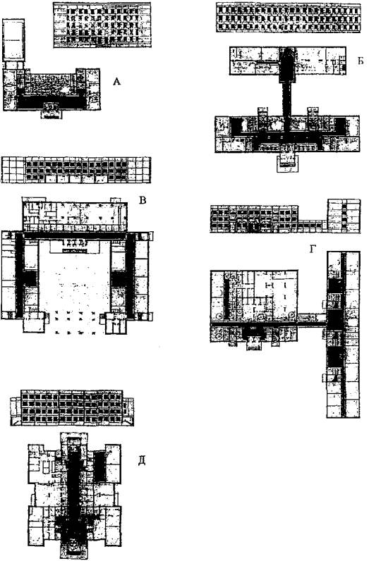 2.4. МЕТОДИКА ФОРМИРОВАНИЯ ФУНКЦИОНАЛЬНОЙ И ОБЪЕМНО-ПЛАНИРОВОЧНОЙ СТРУКТУР БЛОКОВ-ПРИСТРОЕК К СУЩЕСТВУЮЩИМ ЗДАНИЯМ ОБЩЕОБРАЗОВАТЕЛЬНЫХ ШКОЛ, ТРЕБОВАНИЯ К АРХИТЕКТУРНЫМ И КОНСТРУКТИВНЫМ РЕШЕНИЯМ И ИНЖЕНЕРНОМУ ОБОРУДОВАНИЮ2.4.1. Функциональное зонирование блоков-пристроек и связь различных групп помещений должны соответствовать требованиям, предъявляемым к зданиям общеобразовательных школ, кроме того, архитектурно-планировочное решение должно обеспечивать удобную связь помещений блока с основным зданием. При этом связующий элемент должен быть спроектирован так, чтобы блок примыкал непосредственно к требуемой функциональной зоне основного здания. Необходимо исключать образование «проходных зон», в которых могут пересекаться различные возрастные группы учащихся. Например, блок начальных классов должен примыкать к основному зданию, минуя учебные помещения основной и старшей школы. Учебные блоки старших классов должны примыкать к зоне учебных помещений старшей школы или к зоне общешкольных помещений в основном здании. 2.4.2. Особенность формирования объемно-планировочной структуры блоков-пристроек состоит в том, что блок должен проектироваться с учетом его примыкания к существующему зданию. Объем блока не должен затенять фронт окон, особенно учебных помещений, перекрывать подходы к основному зданию, образовывать с его объемом глухие замкнутые пространства, узкие щелевые проходы и т.д. Вместе с тем, объемно-планировочное решение блока-пристройки должно обеспечивать полноценное функционирование всех размещенных в нем групп помещений. 2.4.3. При выборе варианта примыкания блока к существующему зданию школы необходимо исключать затенение одним объемом другого и обеспечивать нормативную инсоляцию учебных помещений и освещенность. Необходимо учитывать, что в школах типа МЮ, 65-426/1 и V-76 учебные помещения ориентированы на три стороны света: западную, южную и восточную, и предпочтение отдавать примыканию блоков-пристроек к существующим зданиям в северовосточной зоне с ориентацией учебных помещений на юг и восток (рис. 10 - 14). В случае примыкания двух блоков-пристроек к существующему зданию школы в северо-западной зоне может размещаться блок общешкольных помещений. Комплекс пристроек в большинстве случаев следует располагать в северной зоне с ориентацией учебных помещений на восток и запад. Исключением могут являться здания школ типов И-1605А и И-1577А, где учебные помещения ориентированы на восток или восток и запад, следовательно, размещение пристроек возможно и в южной зоне. 2.4.4. Специфическим функциональным и объемно-планировочным элементом блоков-пристроек является стыковочный узел, соединяющий существующий и новый объемы. Здание школы и блок-пристройка могут соединяться, непосредственно друг к другу или посредством переходного элемента, представляющего собой самостоятельный объем. 2.4.5. Традиционно в качестве стыковочного узла в школьных комплексах употребляются переходы коридорного типа. Такой элемент служит своеобразным мостиком между двумя объемами и, как правило, проектируется на уровне второго и третьего этажей. В этих случаях под мостиком предусматривается проход или проезд в отсекаемую часть школьного участка или образуемый дворик. 2.4.6. Более предпочтительны стыковочные элементы в виде помещений с 