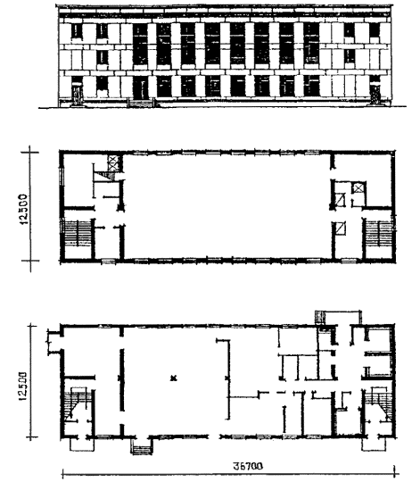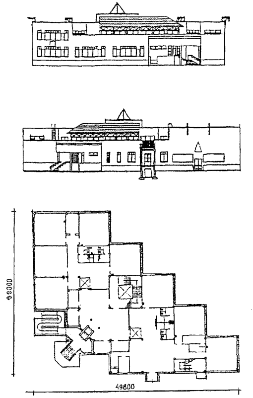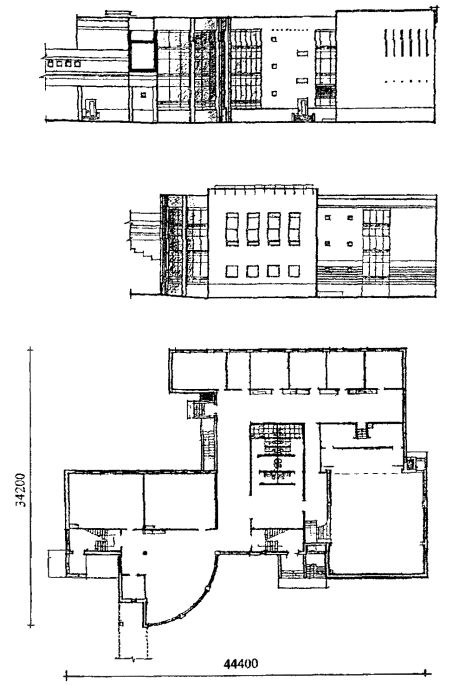 Рис. 3 Проект блока-пристройки эстетического воспитания на 480 учащихся V-80 (разработан в 1982 году). Фасад и план первого этажа.