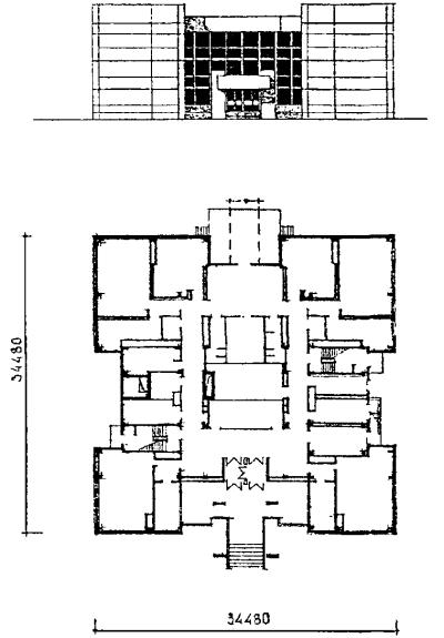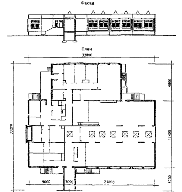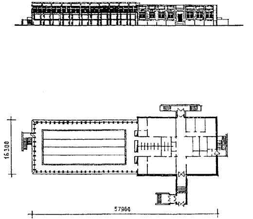 Рис. 4 Проект блока-пристройки бассейна с ванной 30 ´ 12 метров V-849А (разработан в 1980 году). Фасад и план 1 этажа.